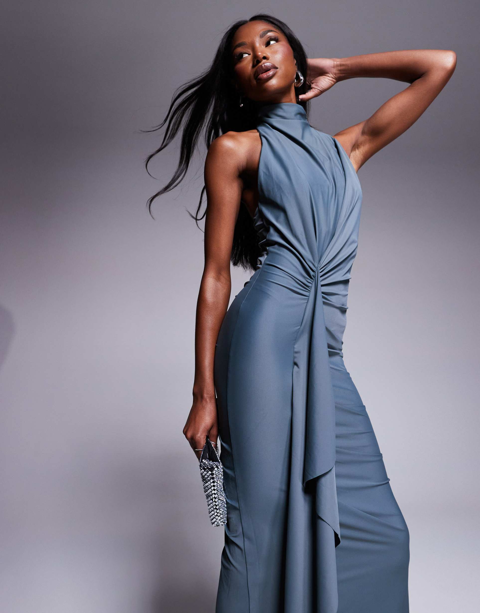ASOS DESIGN SCULPTING JERSEY HIGH NECK DRAPE RUFFLE MAXI DRESS IN SLATE BLUE