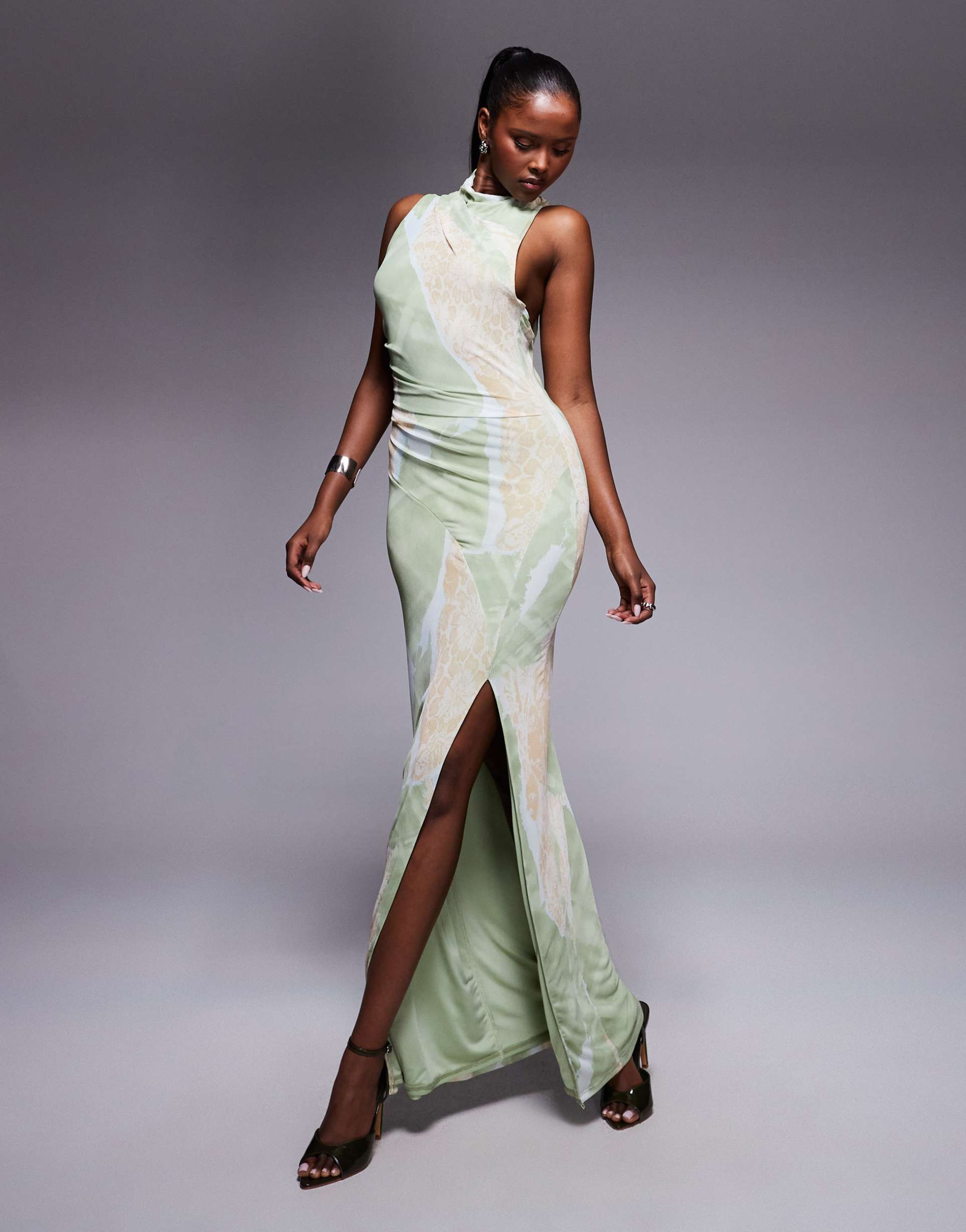 Soft, stretchy mesh fabric with an all-over abstract print sculpts a modern sheath silhouette in this midi dress. The high neckline and sleeveless cut showcase a sleek profile, while ruched detailing and shoulder pads add subtle structure. A daring open back and side slit enhance movement and allure. Ideal for spring and summer evenings, this regular fit dress works perfectly for cocktail events, night outs, or romantic date nights, combining elegant design with contemporary edge and comfort.