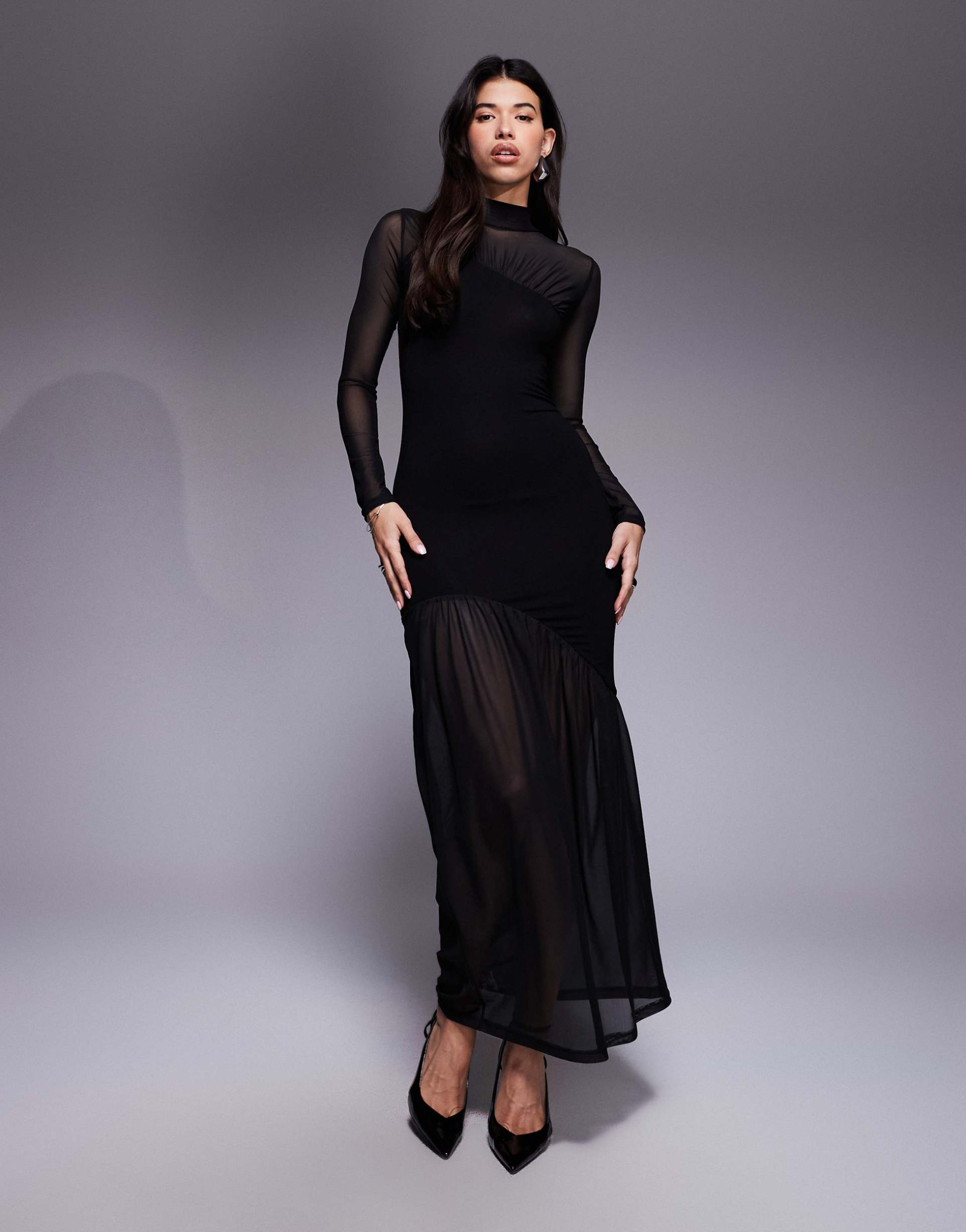 ASOS DESIGN SHEER PANELED MESH HIGH NECK MAXI DRESS IN BLACK