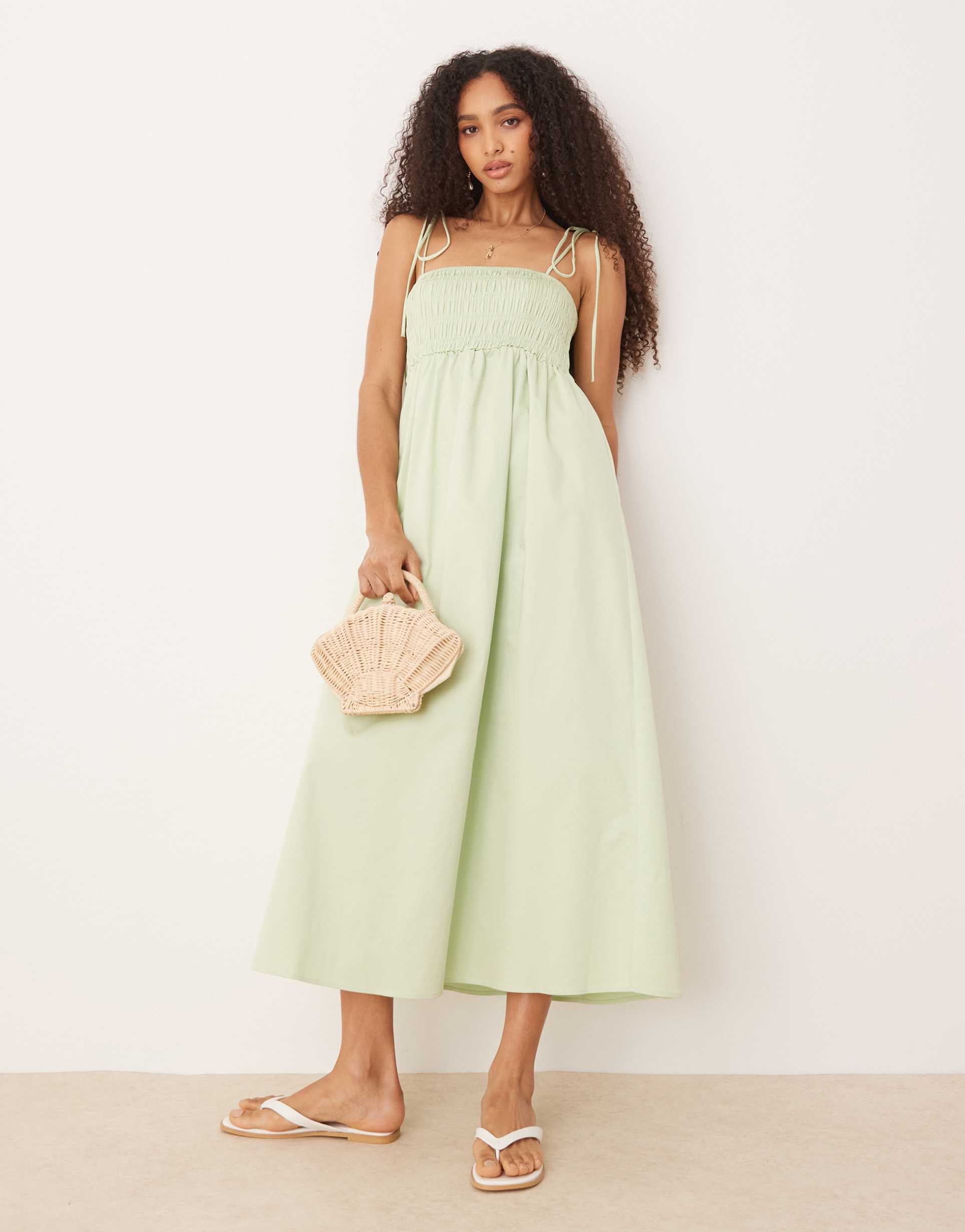 Soft cotton poplin in a matte sage hue shapes this midi dress with a square neckline and tie-up straps, offering a breezy sleeveless silhouette. The shirred bust adds delicate smocking detail on the bodice, enhancing its casual chic appeal. Its regular fit and clean hemline make it perfect for spring and summer days. Ideal for casual outings, brunch dates, or vacation wear, this versatile dress blends comfort with minimalist style.