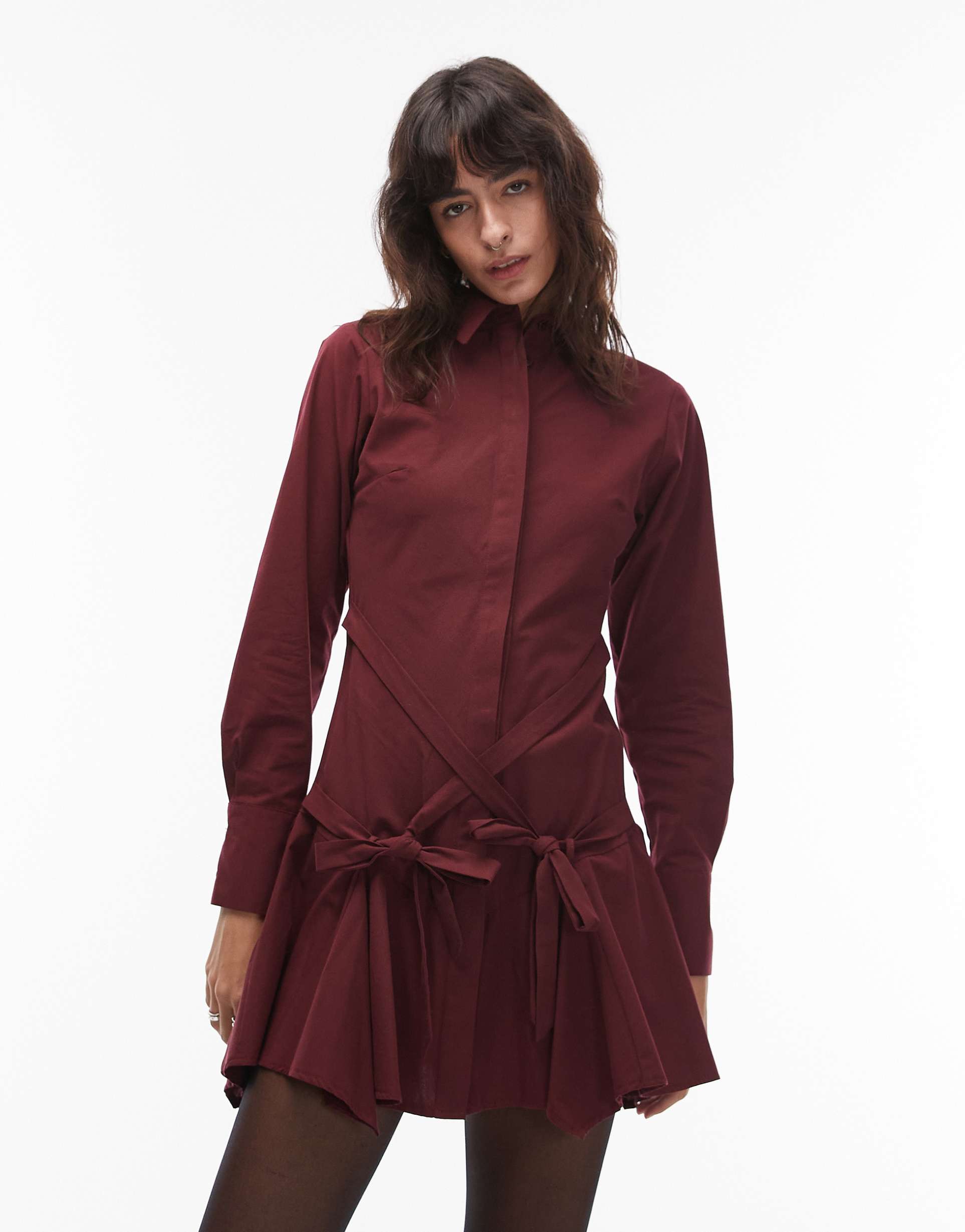 A matte burgundy shirt dress crafted from 100% cotton woven fabric features a classic spread collar and a concealed placket for a sleek look. The regular fit and long cuffed sleeves balance the playful ruffled mini hem, while the tie waist detail with bow and tassel accents enhances the silhouette. Versatile for casual outings, workwear, or brunch, this dress offers both comfort and style across multiple seasons.