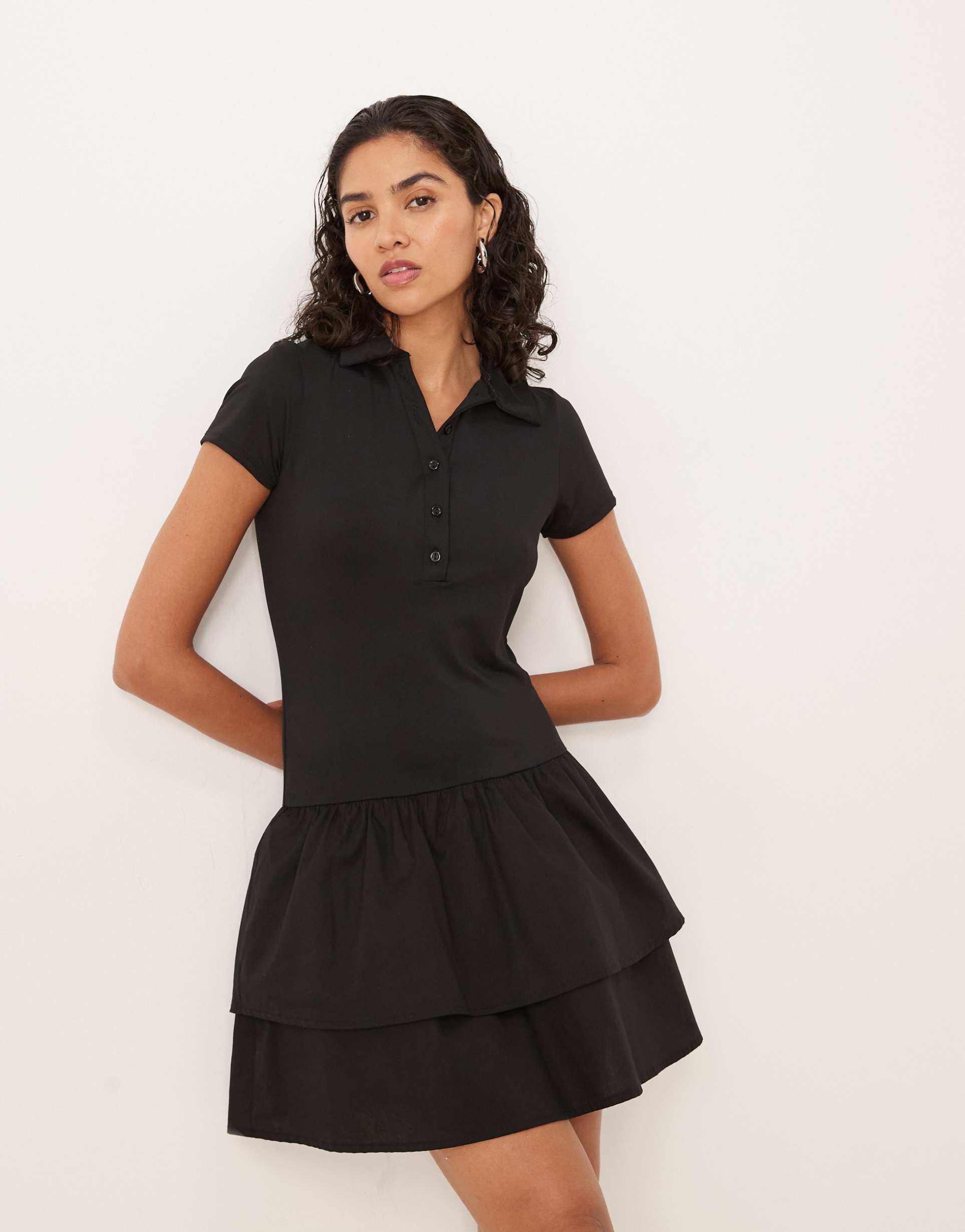 Soft, stretchy jersey fabric shapes a slim-fit mini dress with a classic polo collar and short sleeves, perfect for warm days. The layered, ruffled hem adds playful movement and a touch of feminine flair, making it ideal for casual outings, brunch with friends, or relaxed date nights. This minimalist black shift dress pairs comfort and style effortlessly, offering a versatile option that transitions seamlessly from day to evening wear in spring and summer seasons.