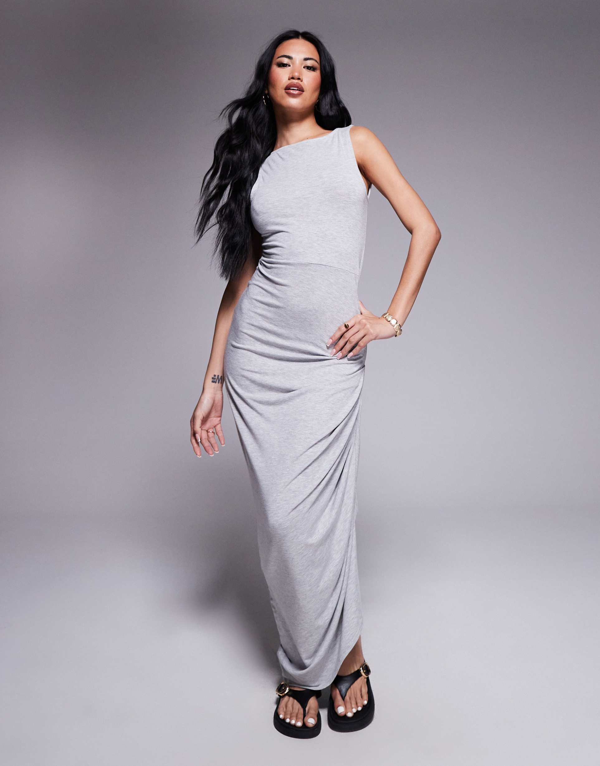 ASOS DESIGN SLASH NECK ASYMMETRIC RUCHED SIDE MIDI IN GRAY HEATHER