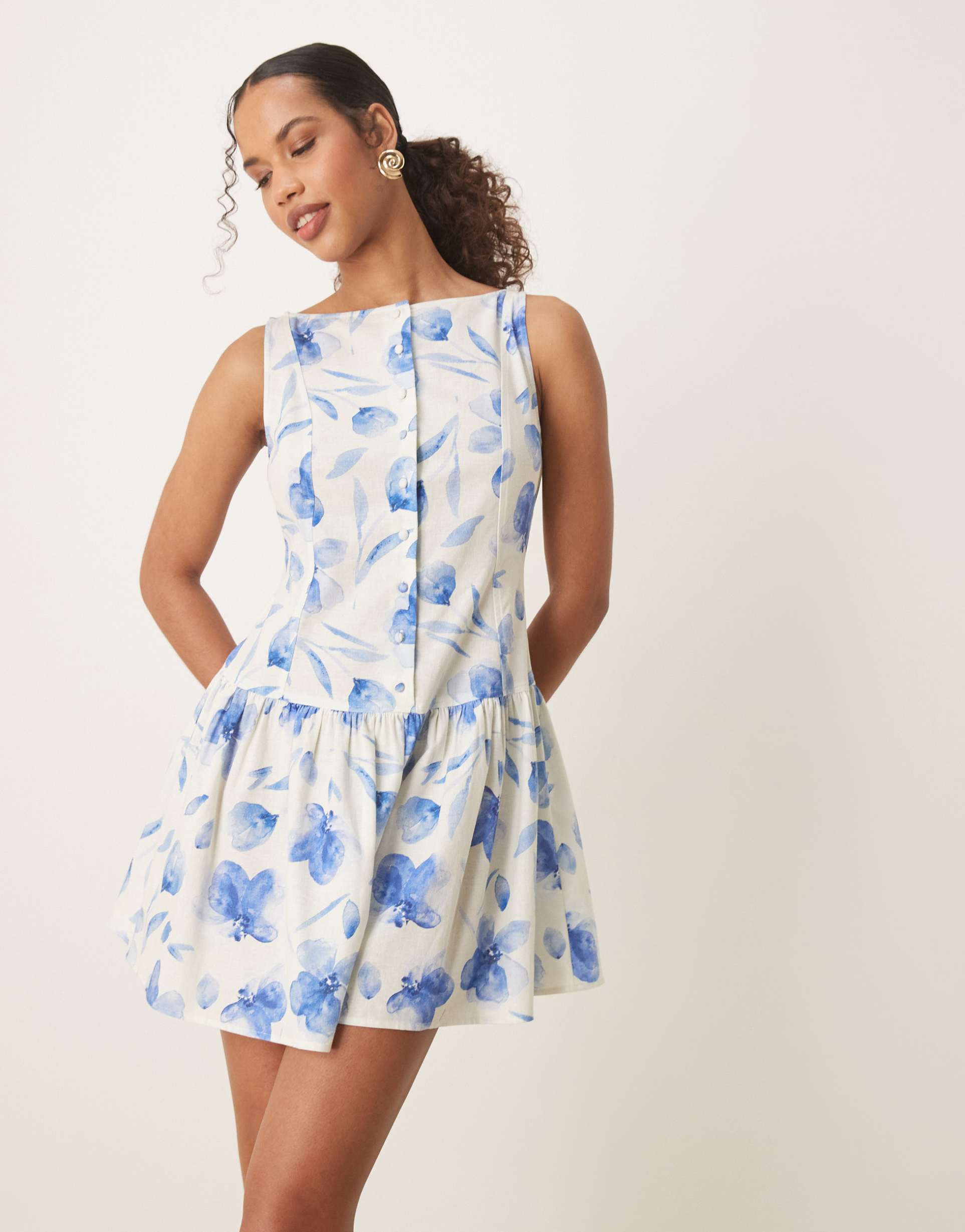 ASOS DESIGN SLASH NECK BUTTON DOWN DROPPED WAIST MINI DRESS IN BLUE PAINTED PRINT