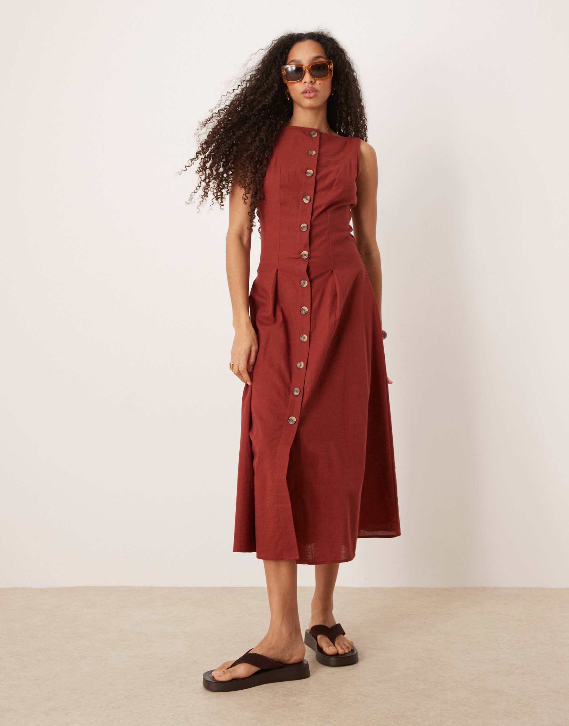 ASOS DESIGN SLASH NECK BUTTON DOWN MIDI VEST DRESS IN BURGUNDY