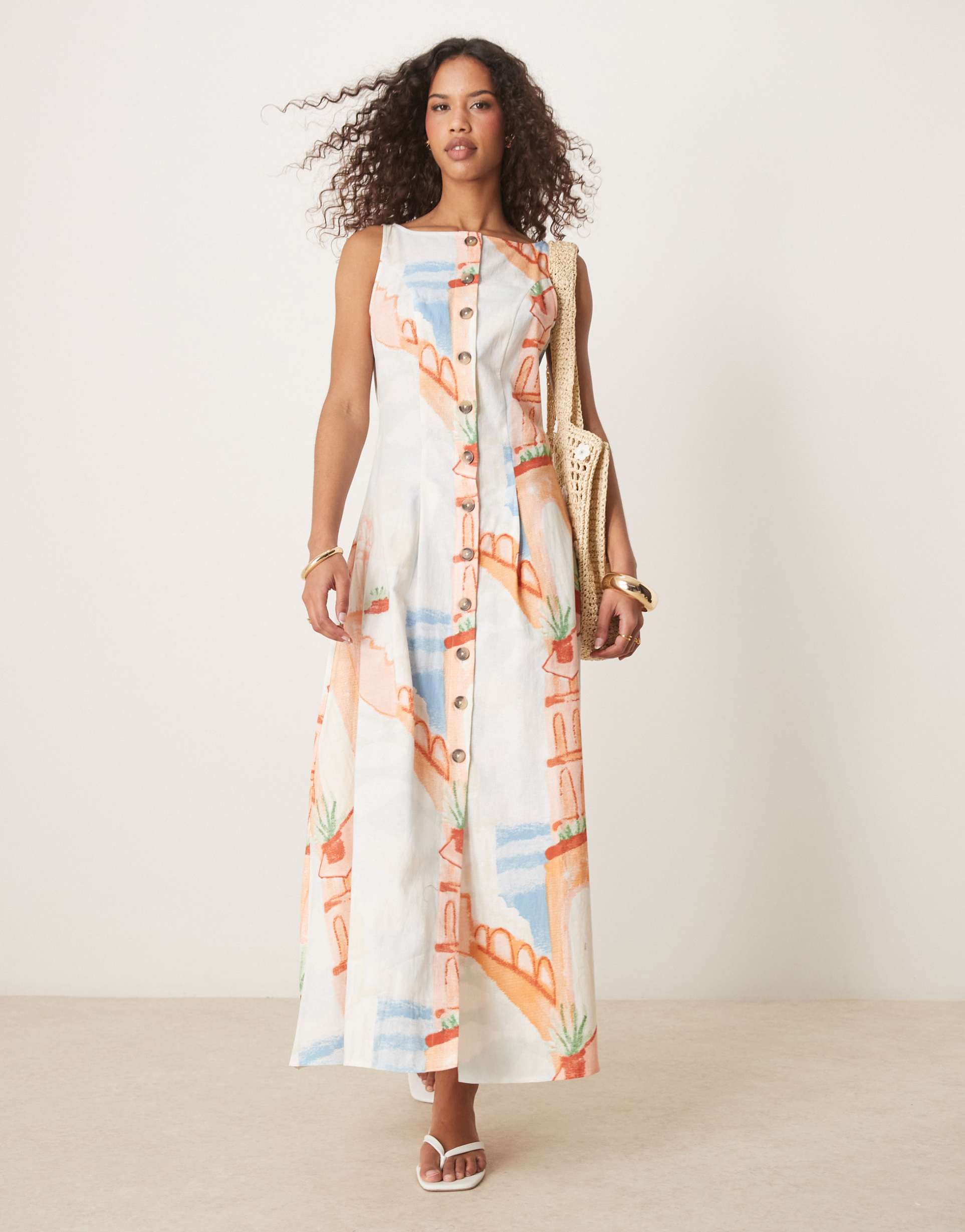 ASOS DESIGN SLASH NECK BUTTON DOWN VEST MAXI DRESS IN POSTCARD PRINT