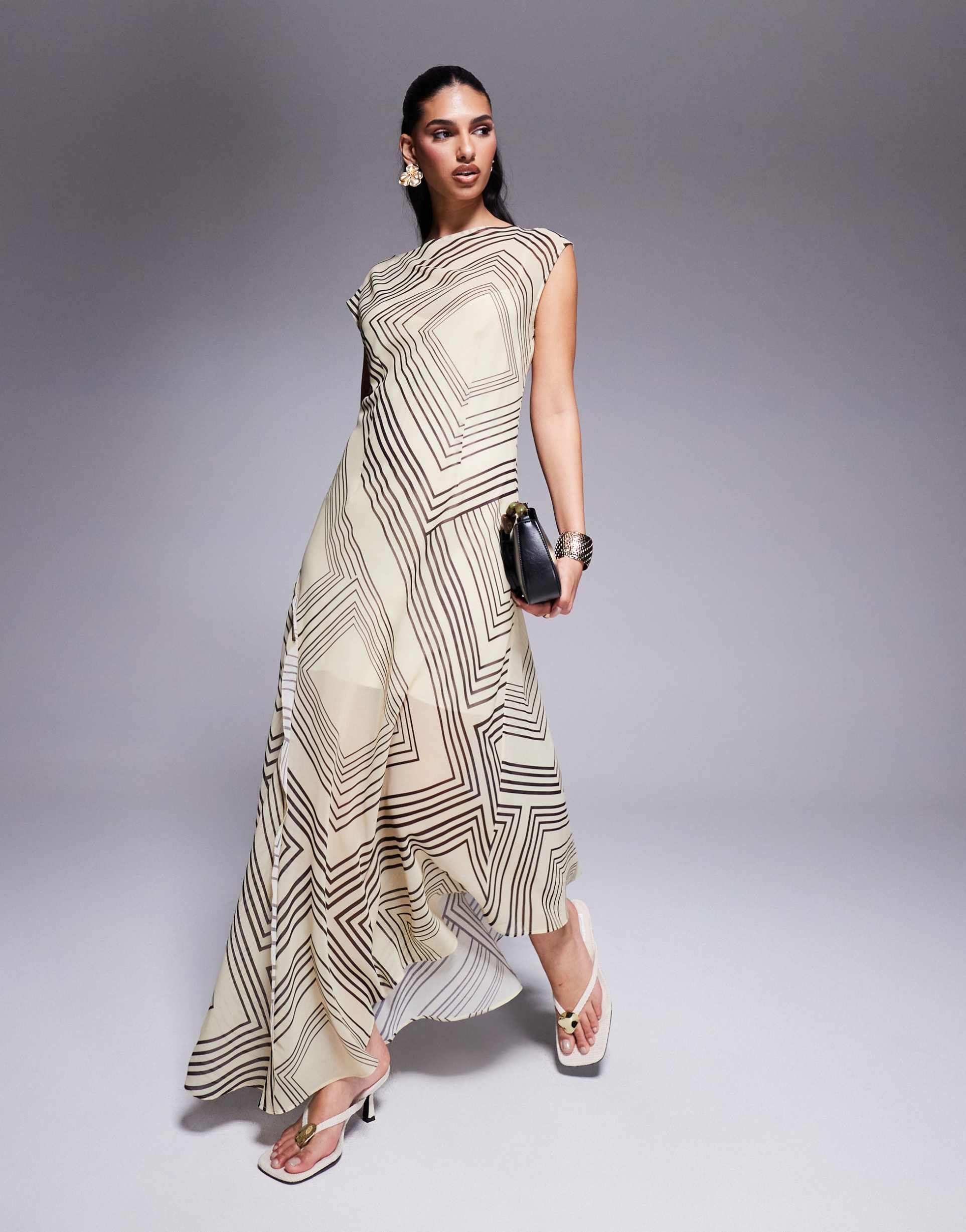 Soft chiffon fabric and an abstract striped print define this elegant maxi dress featuring a high neckline and sleeveless design. The asymmetric hem adds a modern touch to its flowing A-line silhouette, offering a regular fit that drapes beautifully. Ideal for spring and summer occasions, this versatile dress suits brunch, date nights, and cocktail events with ease. The matte beige base color accented by matte brown stripes creates a sophisticated palette perfect for minimalist wardrobes seeking a chic, contemporary vibe.