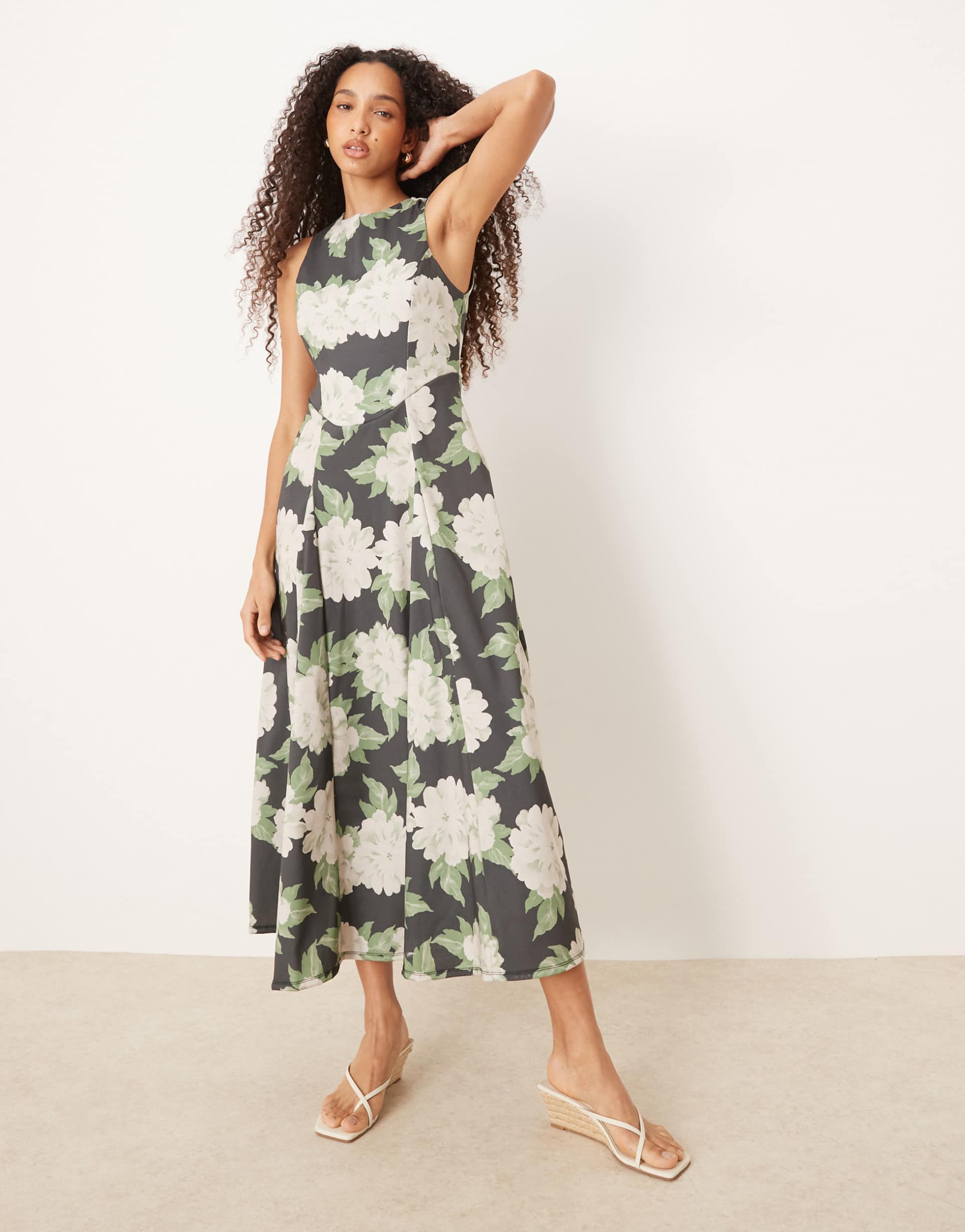 ASOS DESIGN SLEEVELESS CORSET WAIST MIDI DRESS IN GREEN FLORAL PRINT