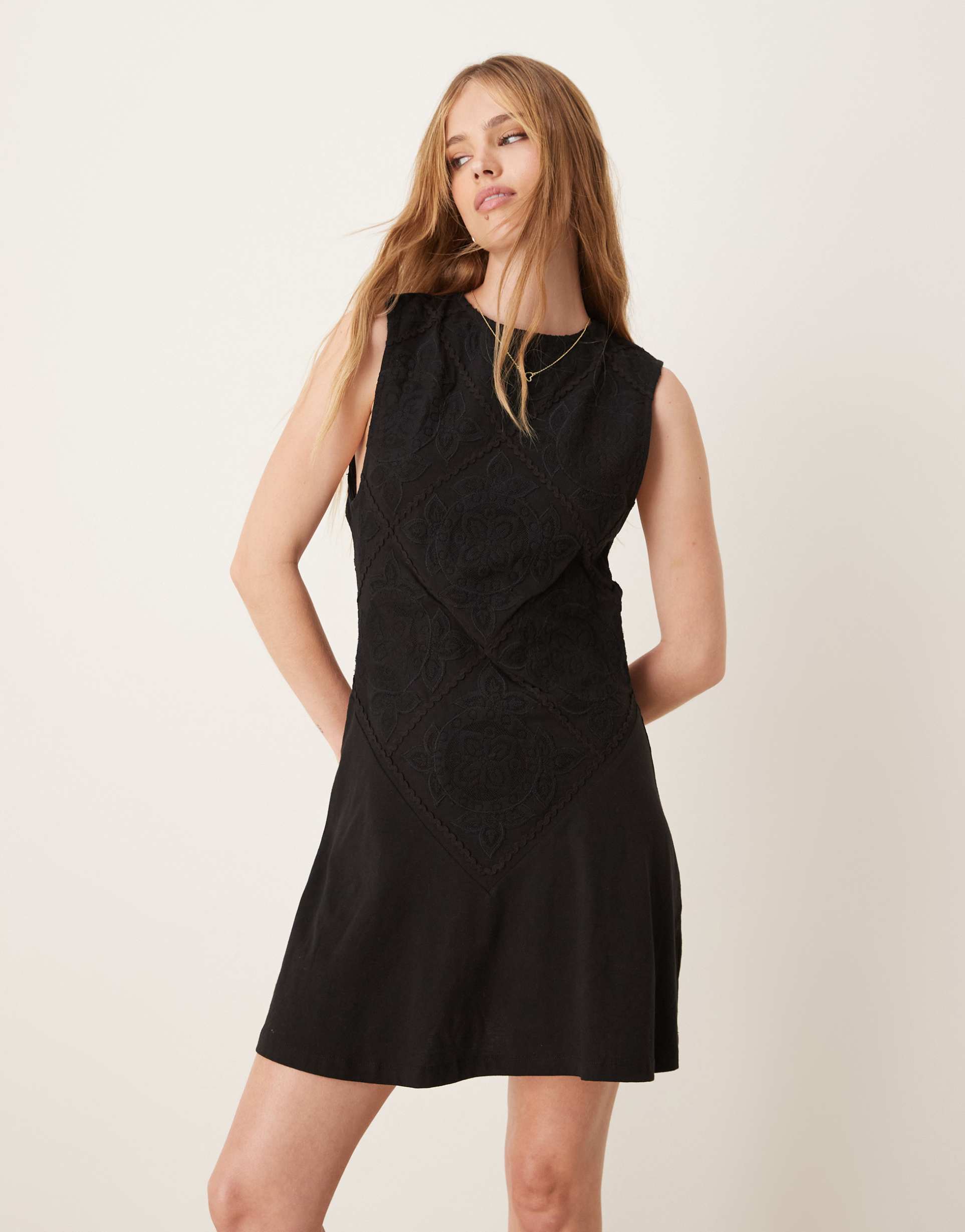 ASOS DESIGN SLEEVELESS CROCHET PATCH MINI DRESS IN BLACK