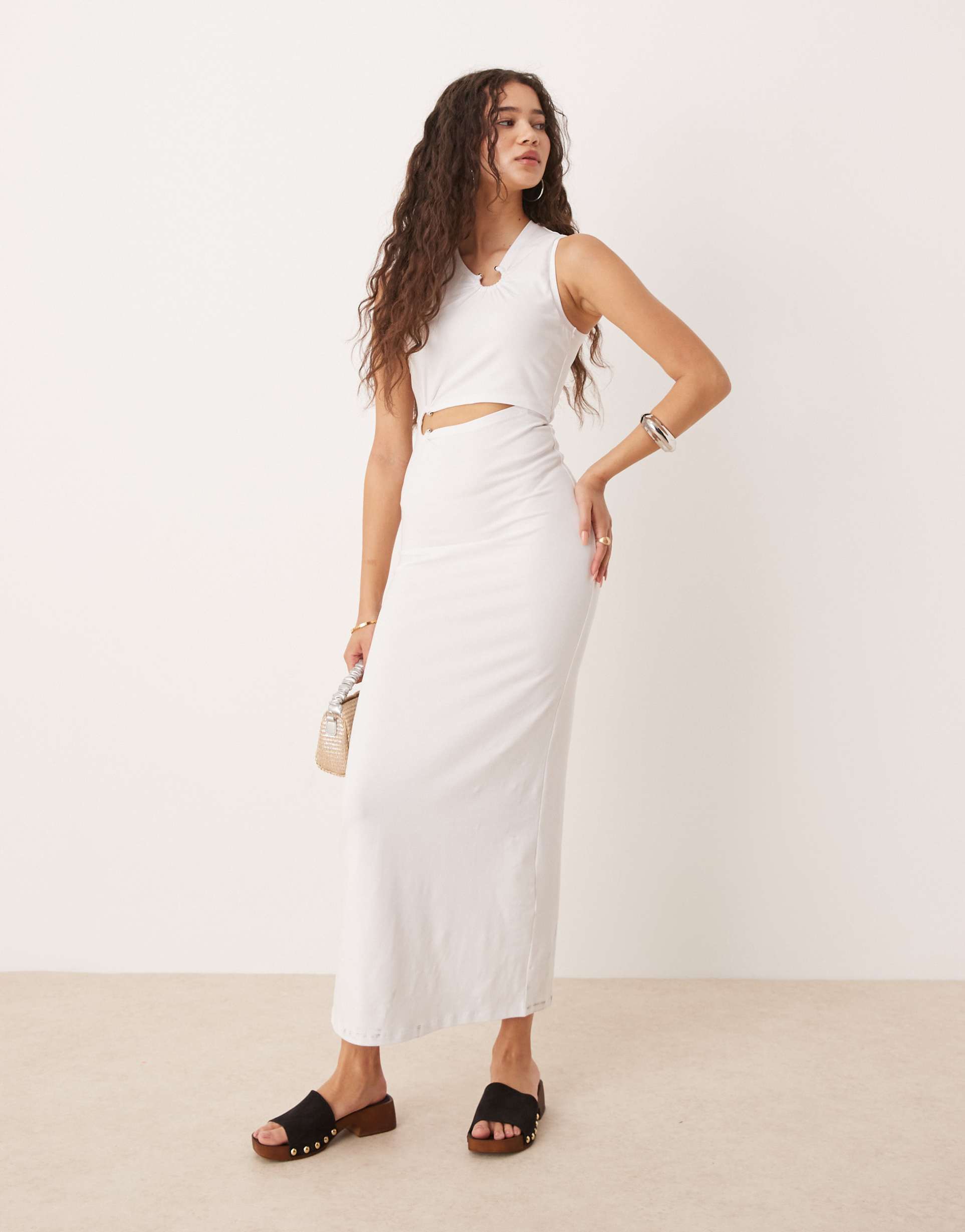 ASOS DESIGN SLEEVELESS CUT-OUT RING TRIM DETAIL MIDI DRESS IN WHITE