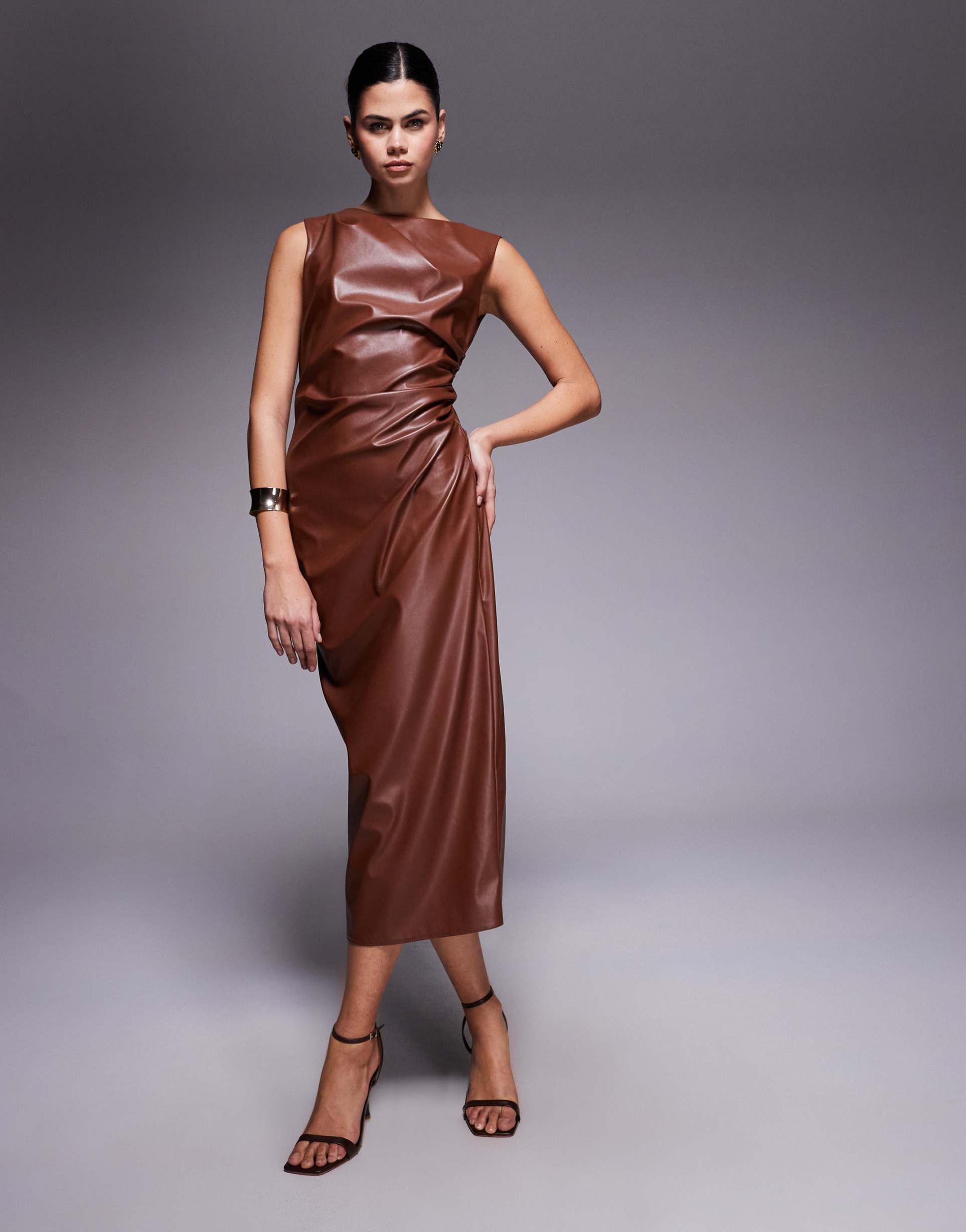 ASOS DESIGN SLEEVELESS RUCHED LEATHER LOOK MIDI DRESS IN TAN