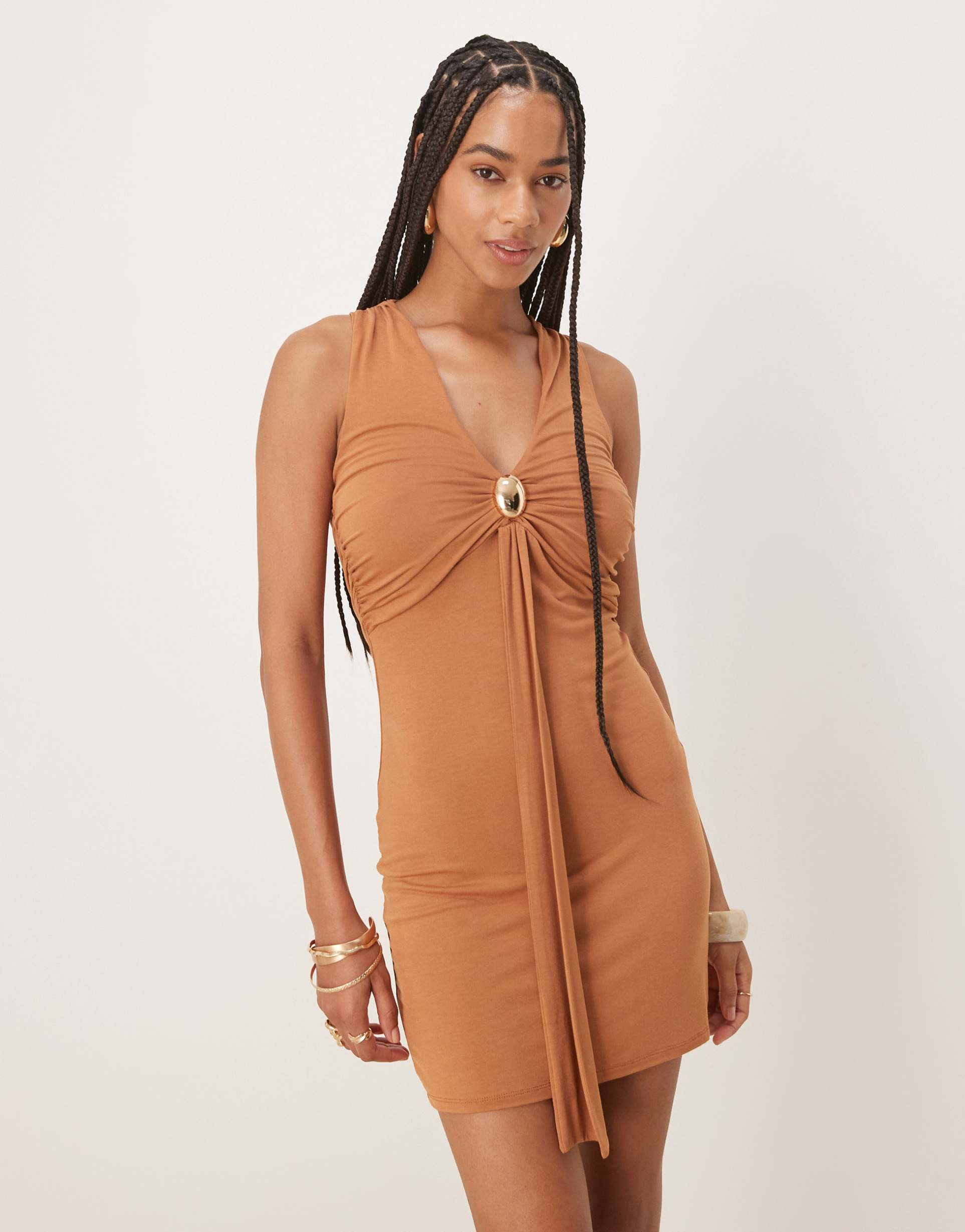 ASOS DESIGN SLEEVELESS V FRONT MINI DRESS WITH GOLD TRIM IN CAMEL