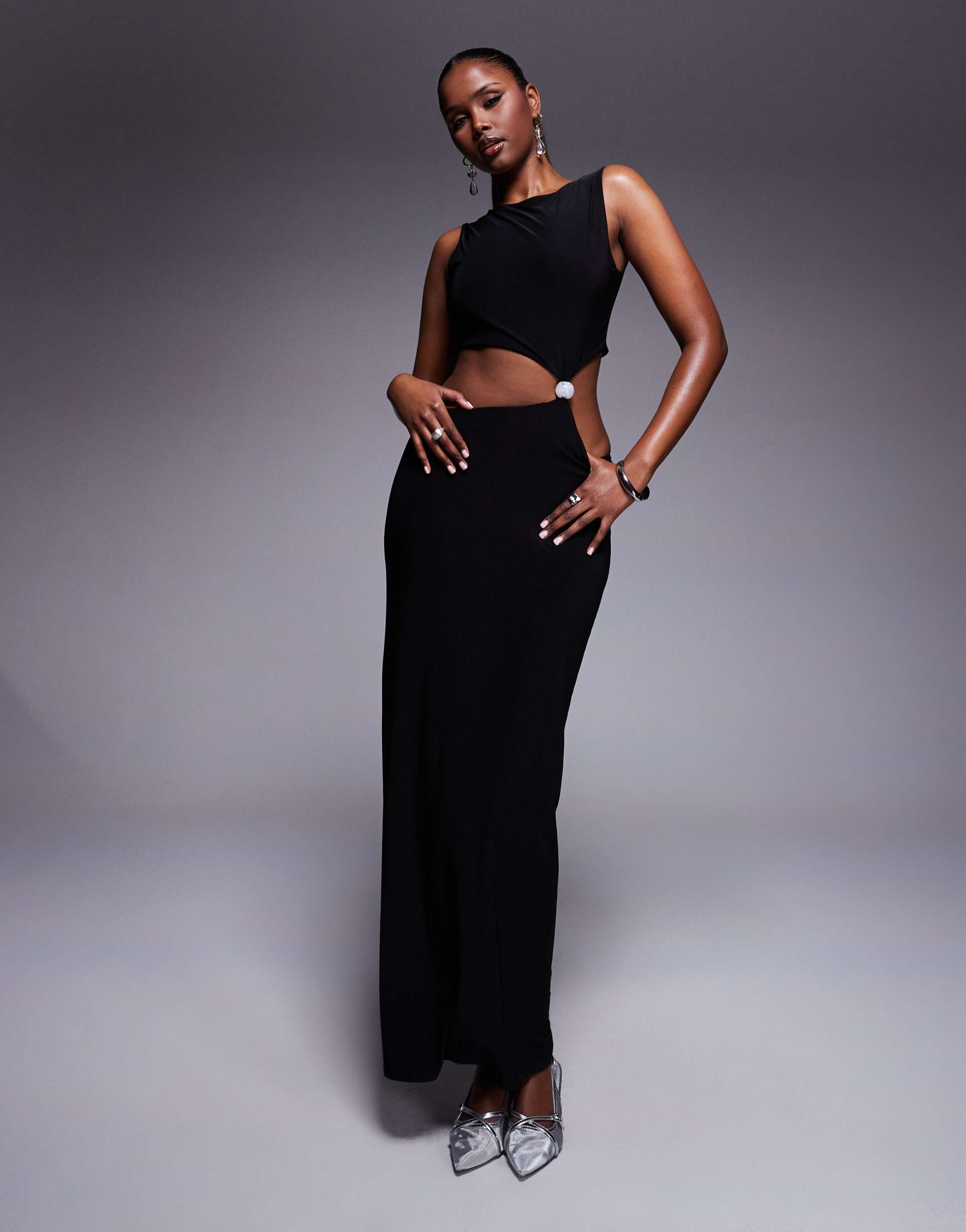 ASOS DESIGN SLINKY CUT OUT WITH PEARL TRIM AND SIDE SPLIT MAXI DRESS IN BLACK