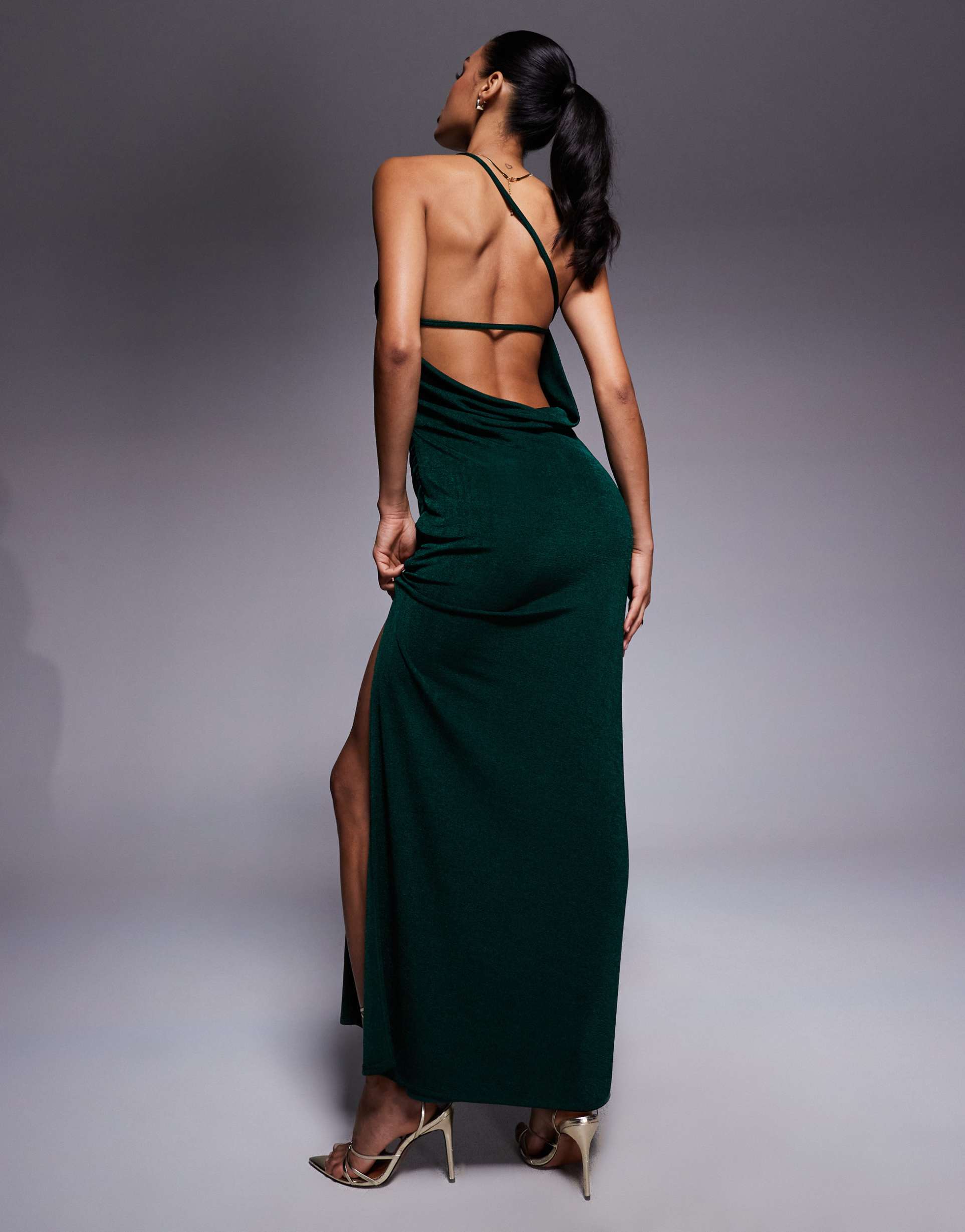 ASOS DESIGN SLINKY ONE-SHOULDER MAXI DRESS WITH SIDE SLIT IN BOTTLE GREEN