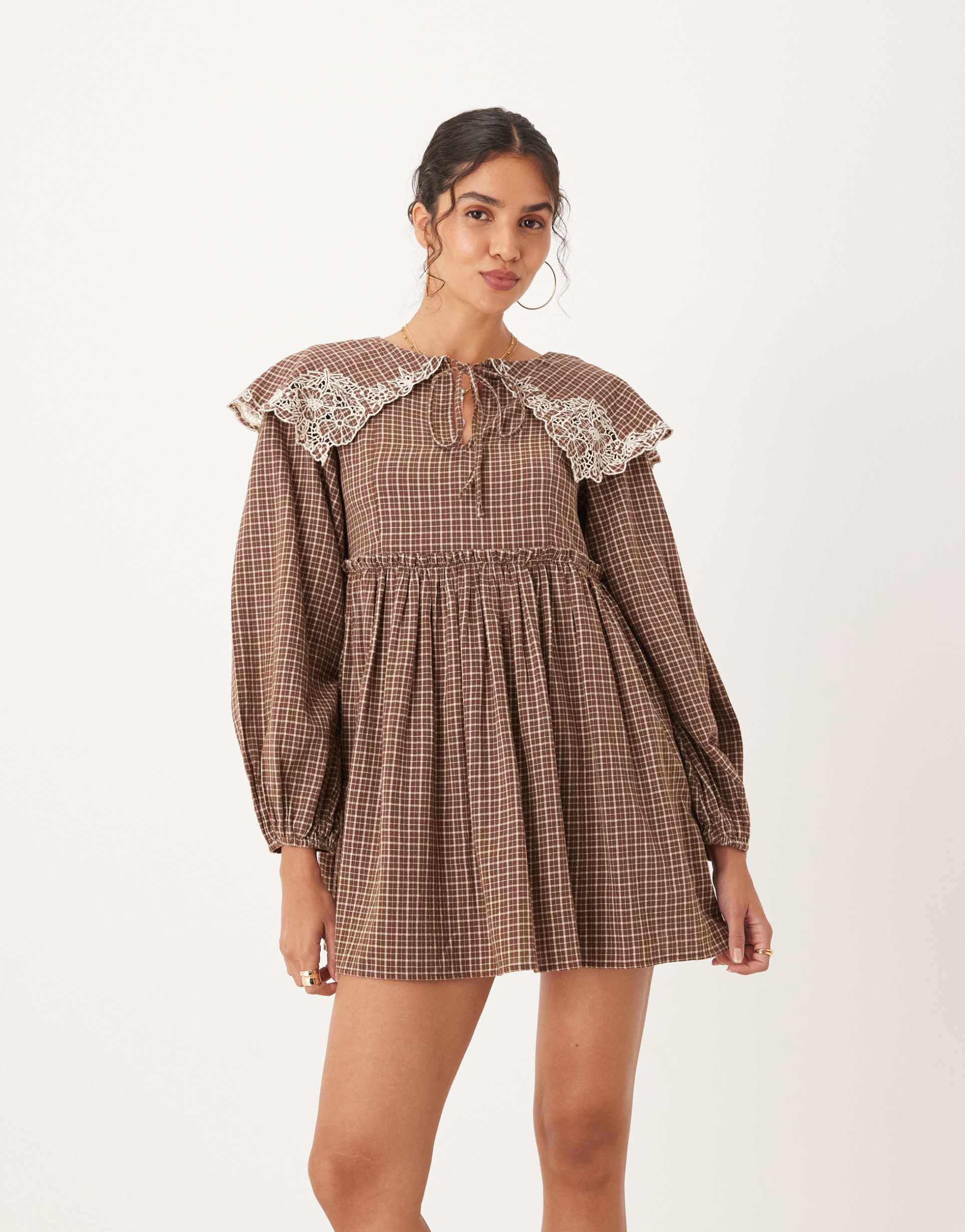 ASOS DESIGN SMOCK MINI DRESS WITH OVERSIZED COLLAR AND LACE TRIMS IN TAN CHECK