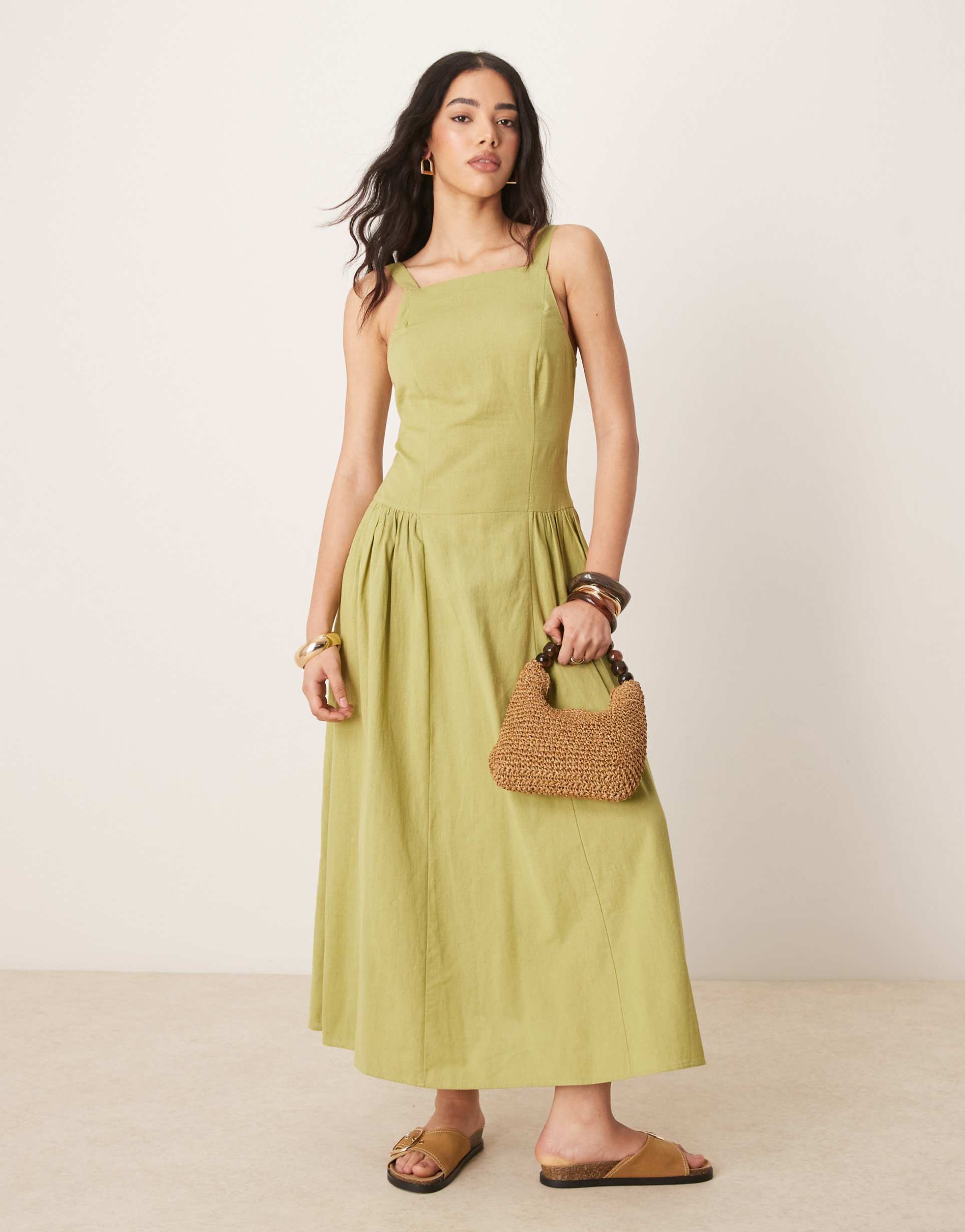 ASOS DESIGN SQUARE NECK DROPPED WAIST MIDI DRESS IN GREEN