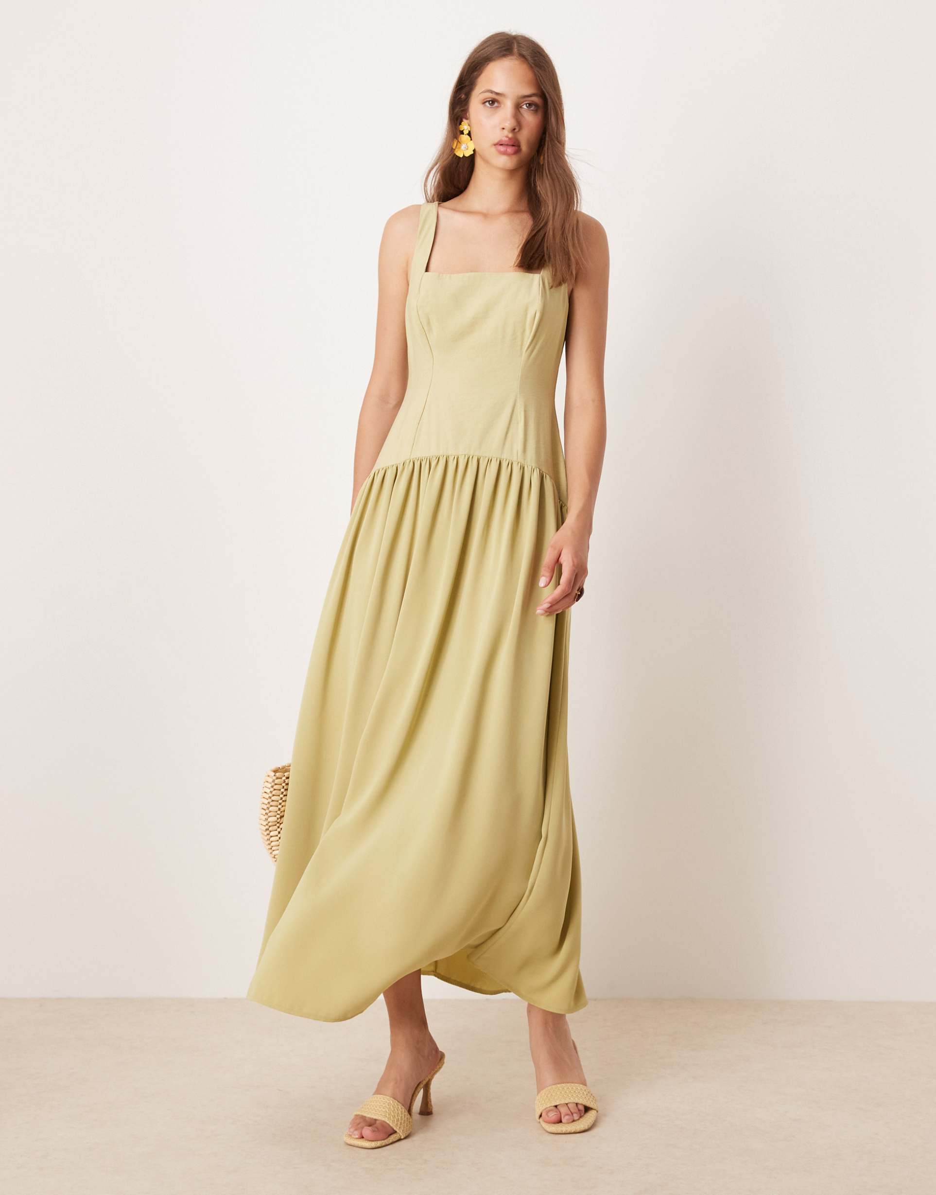 ASOS DESIGN SQUARE NECK DROPPED WAIST MIDI DRESS IN OLIVE