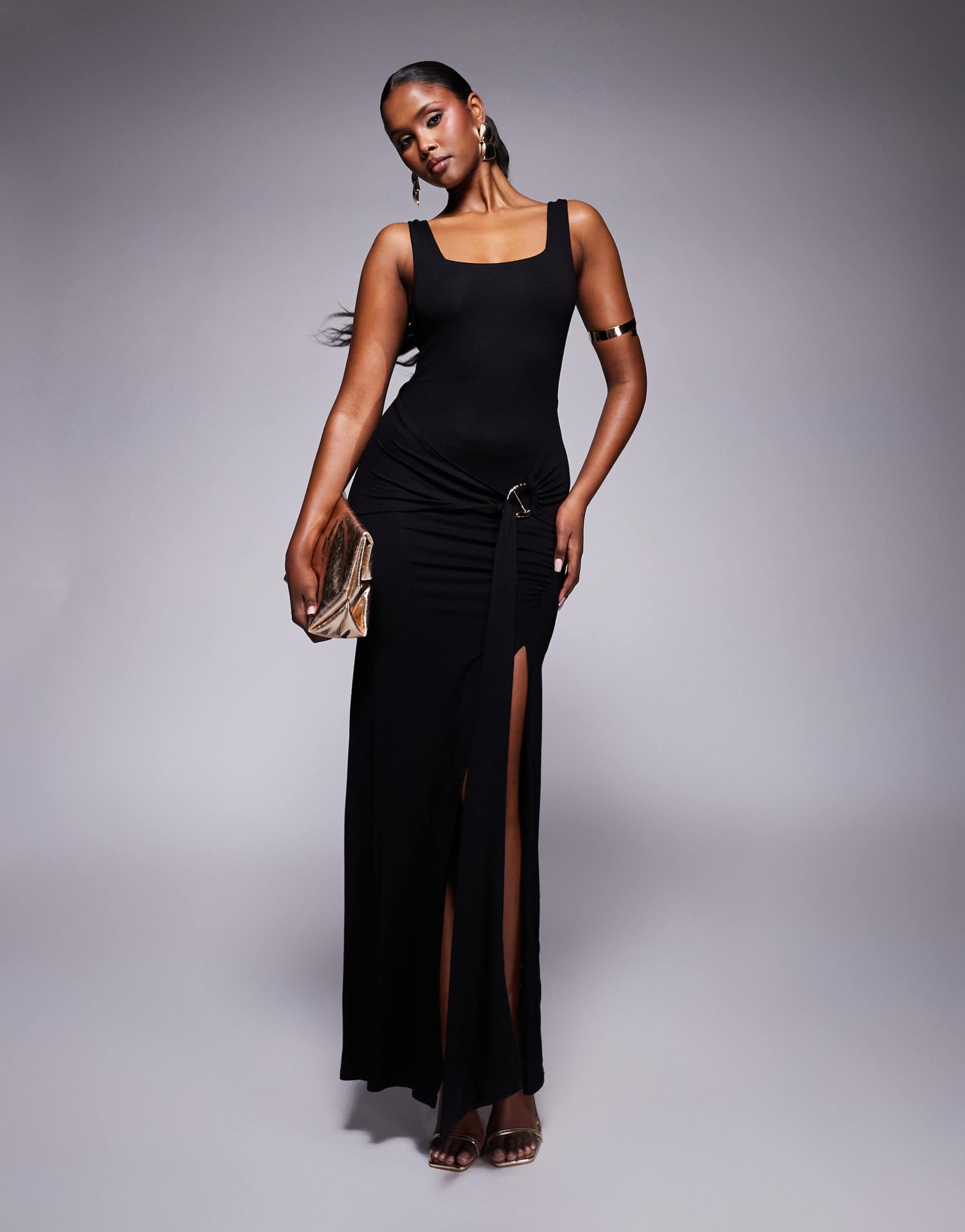 ASOS DESIGN SQUARE NECK MAXI DRESS WITH HARDWARE TRIM AND TIE WAIST DETAIL IN BLACK