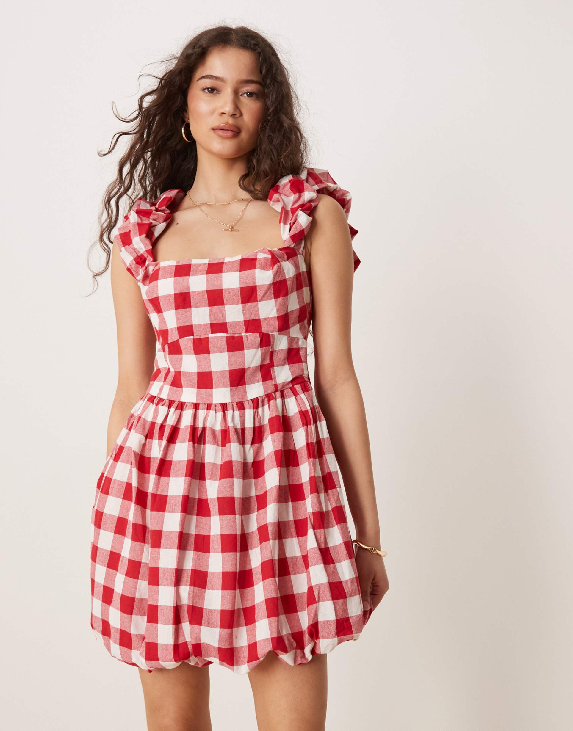 ASOS DESIGN SQUARE NECK MINI SMOCK DRESS WITH BUBBLE HEM IN RED GINGHAM
