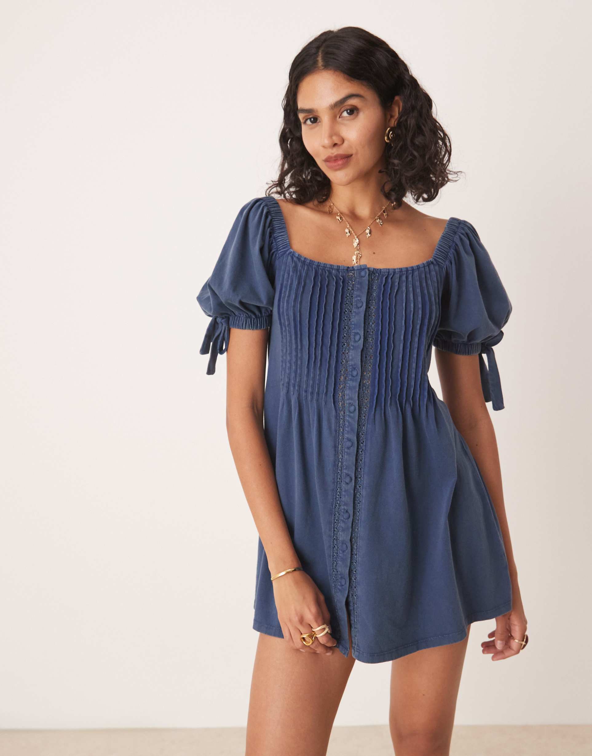 Soft cotton jersey fabric and a regular fit create a comfortable and flattering silhouette in this mini shift dress. Featuring a square neckline and half puffed sleeves with tie details, it is finished with pintuck detailing along the button-up front. The washed indigo blue hue adds a classic touch, making it ideal for casual outings, brunch dates, or relaxed evenings. The clean hemline and versatile style ensure easy pairing with sandals or sneakers for warm weather seasons.
