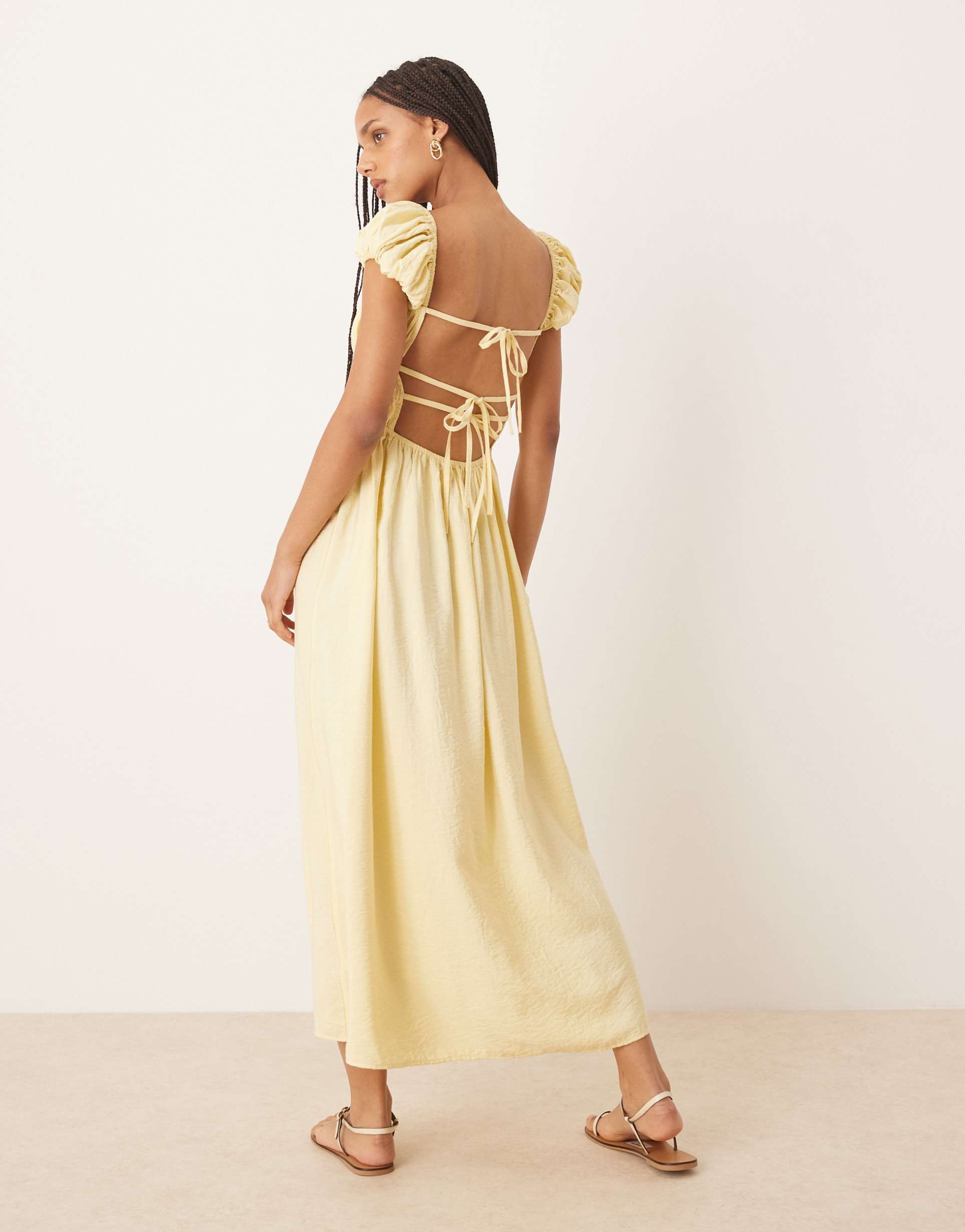 Soft butter yellow hues and a square neckline define this midi dress, featuring charming puffed short sleeves and a cinched channel waist for a flattering regular fit. The open back with tie-up fastening adds a delicate touch of femininity, while the woven viscose-nylon blend offers lightweight comfort and subtle texture. Ideal for spring and summer occasions, this classic shift silhouette is perfect for brunches, date nights, or everyday wear, effortlessly blending casual chic with timeless style.