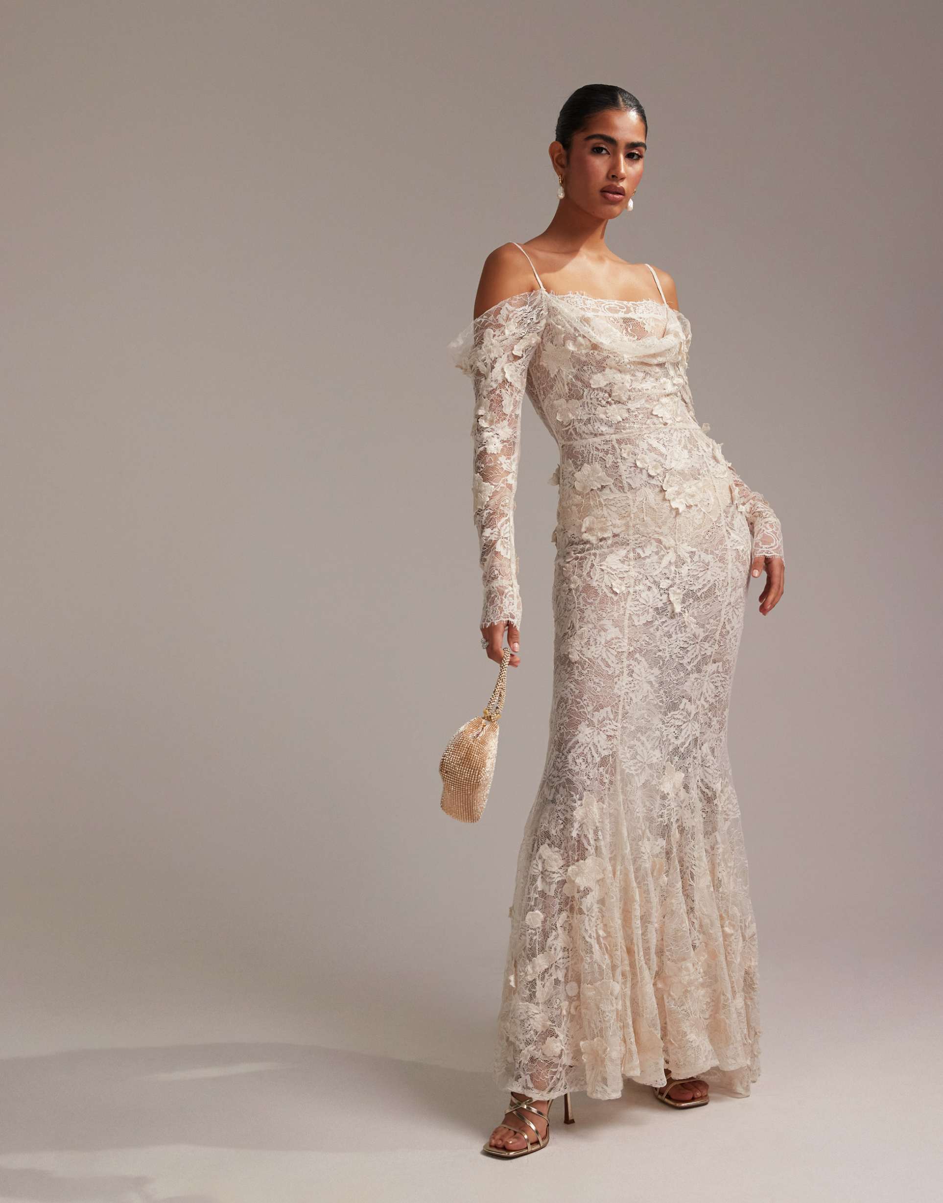 ASOS DESIGN STATEMENT APPLIQUE LACE FISHTAIL MAXI WEDDING DRESS IN IVORY