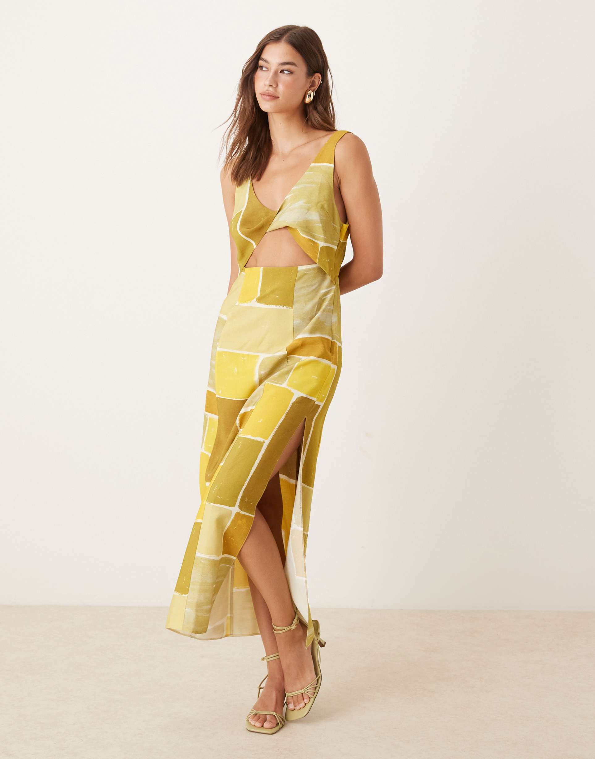 Sunlit afternoons and warm evenings come alive in this ASOS DESIGN slip dress featuring a vivid abstract square print in yellow and beige tones. The midi length and regular fit create a flattering silhouette enhanced by a twist detail at the bust and cut-out open back. Fixed spaghetti straps and a V-neckline add modern appeal, while button and invisible zipper closures ensure ease. Crafted from a soft viscose-polyester blend, this dress is perfect for casual outings, brunch dates, or night events in spring and summer.