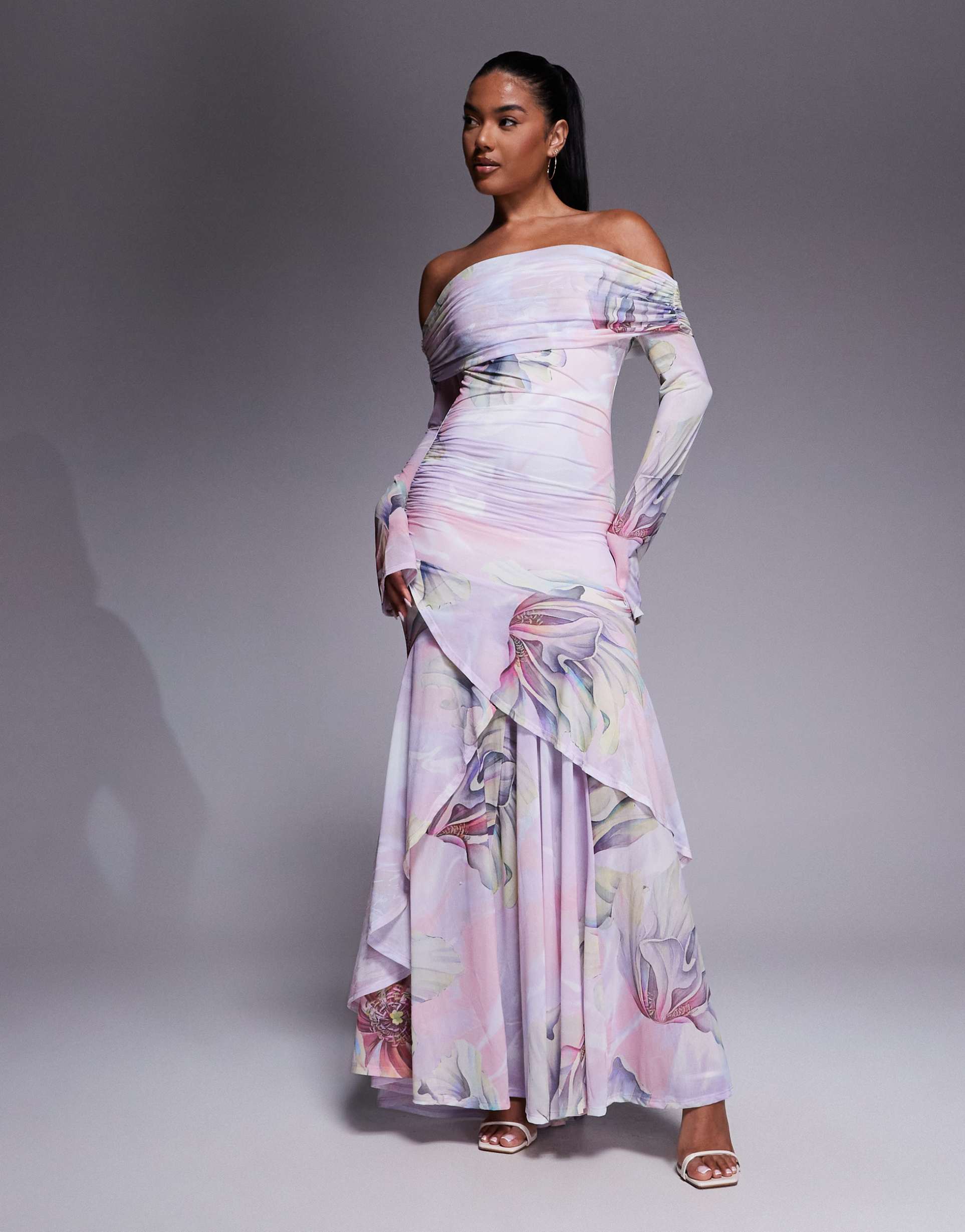 ASOS DESIGN STRETCH CHIFFON LONG SLEEVE OFF THE SHOULDER MAXI DRESS WITH RUFFLE HEM IN FLORAL PRINT
