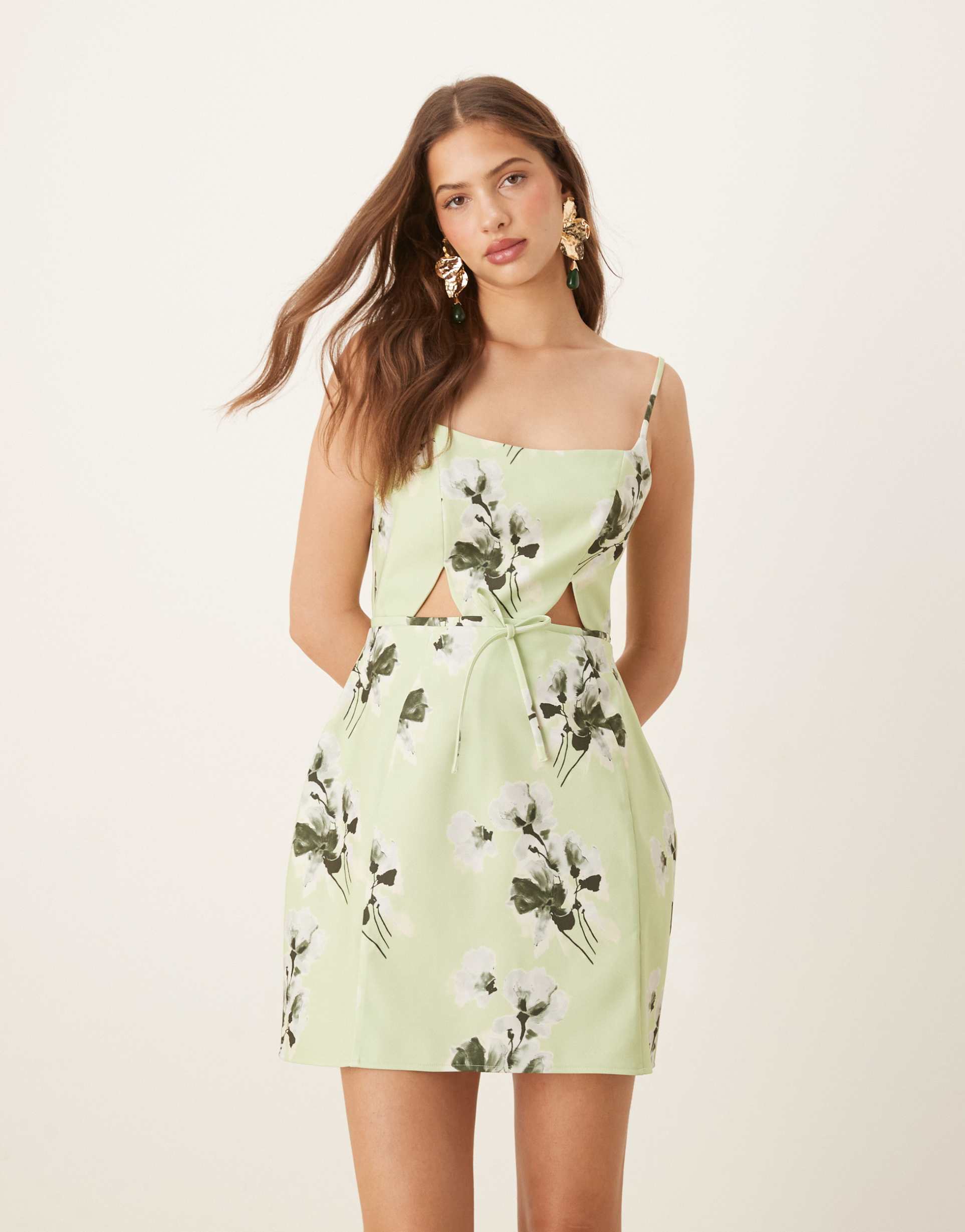 ASOS DESIGN STRUCTURED CUTOUT MINI DRESS WITH BOW IN SAGE FLORAL PRINT