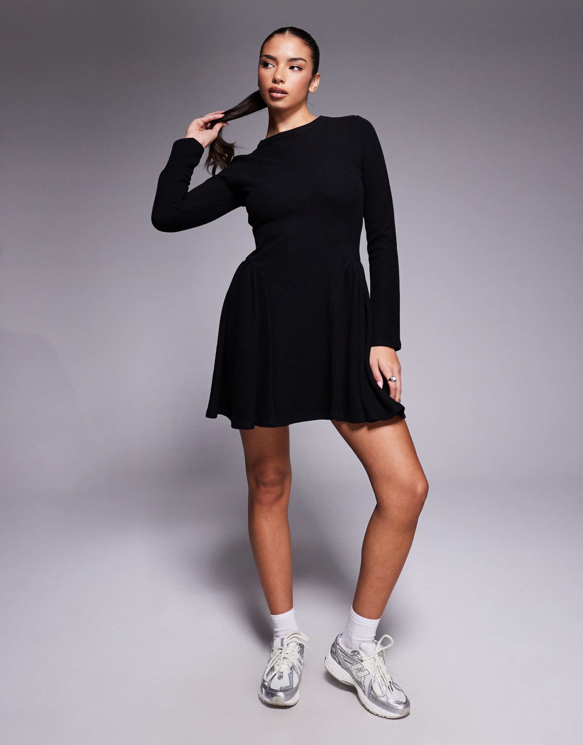 ASOS DESIGN SUPERSOFT LONG SLEEVE GODET MINI DRESS IN BLACK