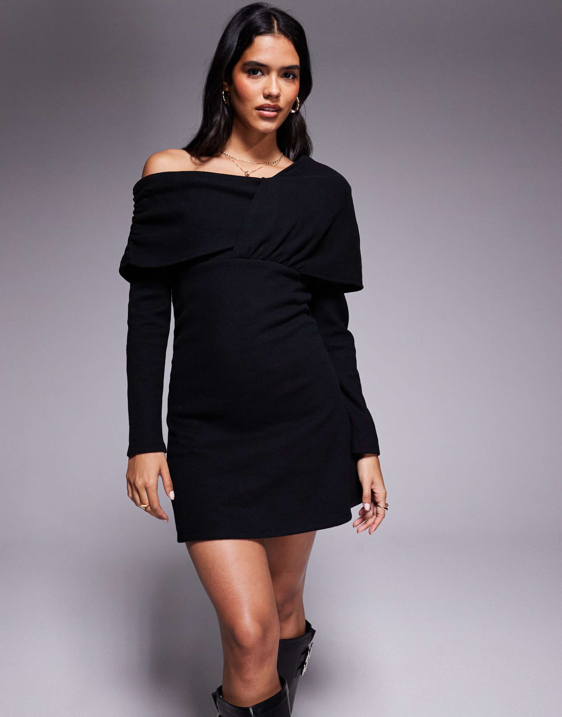 Soft jersey fabric combined with a figure-flattering regular fit creates an effortlessly chic look in this black mini wrap dress. Featuring long sleeves and an asymmetric neckline with a stylish fold-over panel, it offers modern minimalist appeal perfect for autumn and winter. The draped front detail adds subtle texture to the clean silhouette, while the mini length showcases legs beautifully. This versatile piece suits cocktail parties, night outs, and date nights with ease, blending comfort and contemporary style seamlessly.