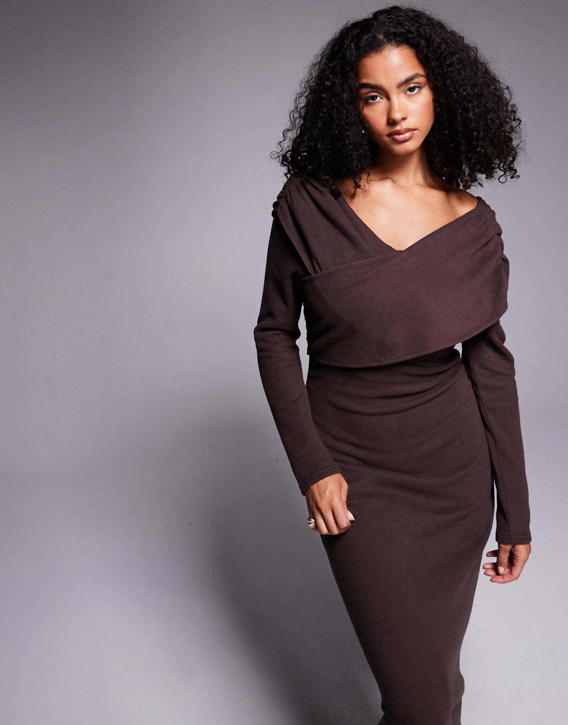 Soft, supersoft jersey fabric combines cotton and polyester for a comfortable stretch in this chocolate brown wrap dress. The slim fit silhouette with a flattering V-neckline and long sleeves offers a sophisticated look perfect for autumn and winter evenings. Gathered detailing at the front adds subtle texture to the clean, midi-length hemline. This versatile wrap dress transitions seamlessly from date nights and cocktail parties to stylish nights out, embodying minimalist elegance with effortless charm.