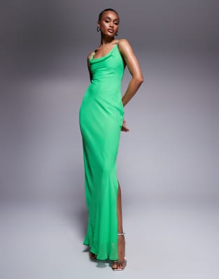 Soft chiffon fabric with a matte green finish creates a flowing maxi slip dress featuring a sophisticated cowl neckline and a strappy criss-cross back. The regular fit is enhanced with a side slit for elegant movement. This tall design is perfect for spring and summer occasions such as cocktail parties, formal events, and romantic date nights, combining comfort with timeless style.