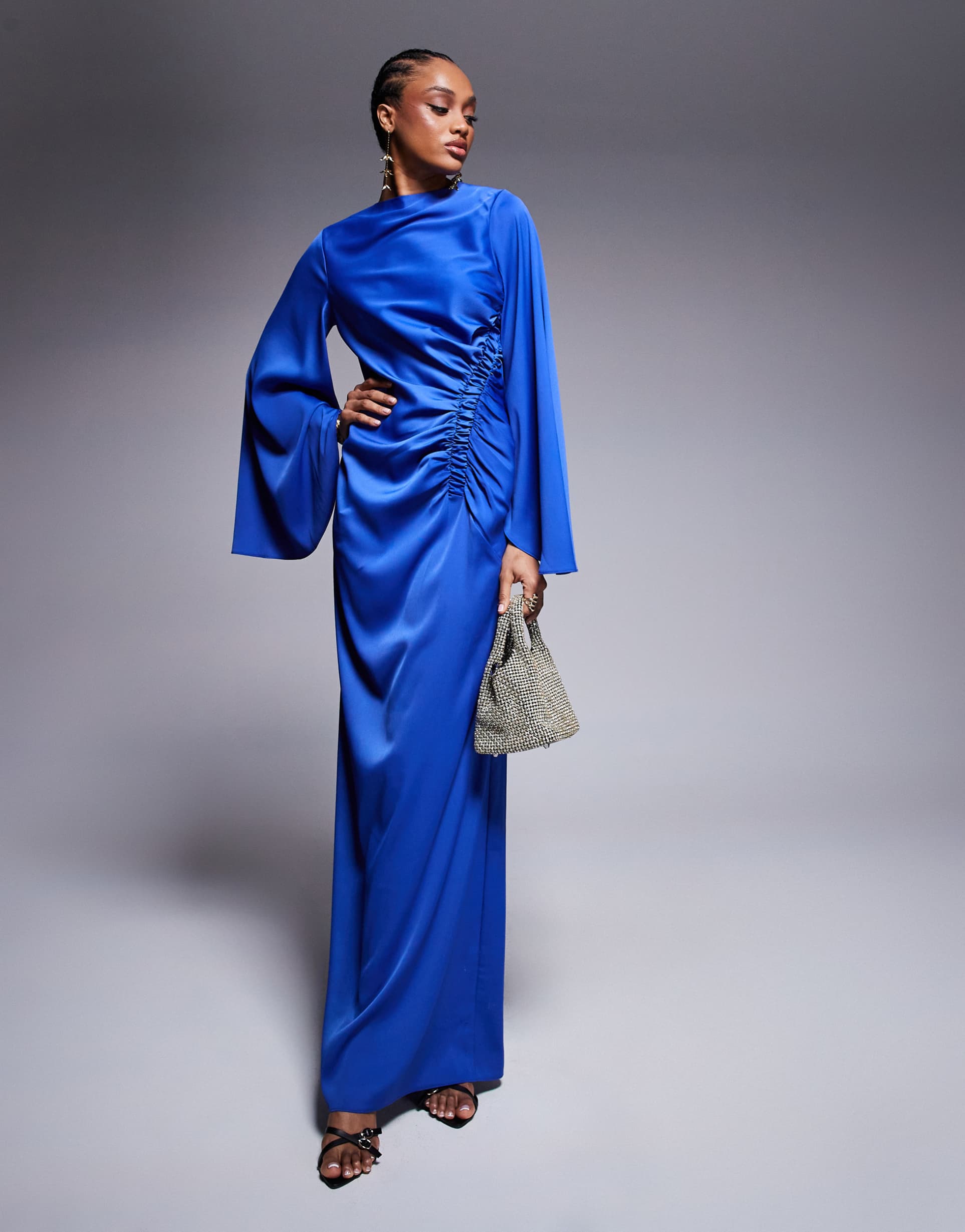 ASOS DESIGN TALL EXAGGERATED SLEEVES BIAS CUT MAXI DRESS WITH RUCHED WAIST IN COBALT BLUE