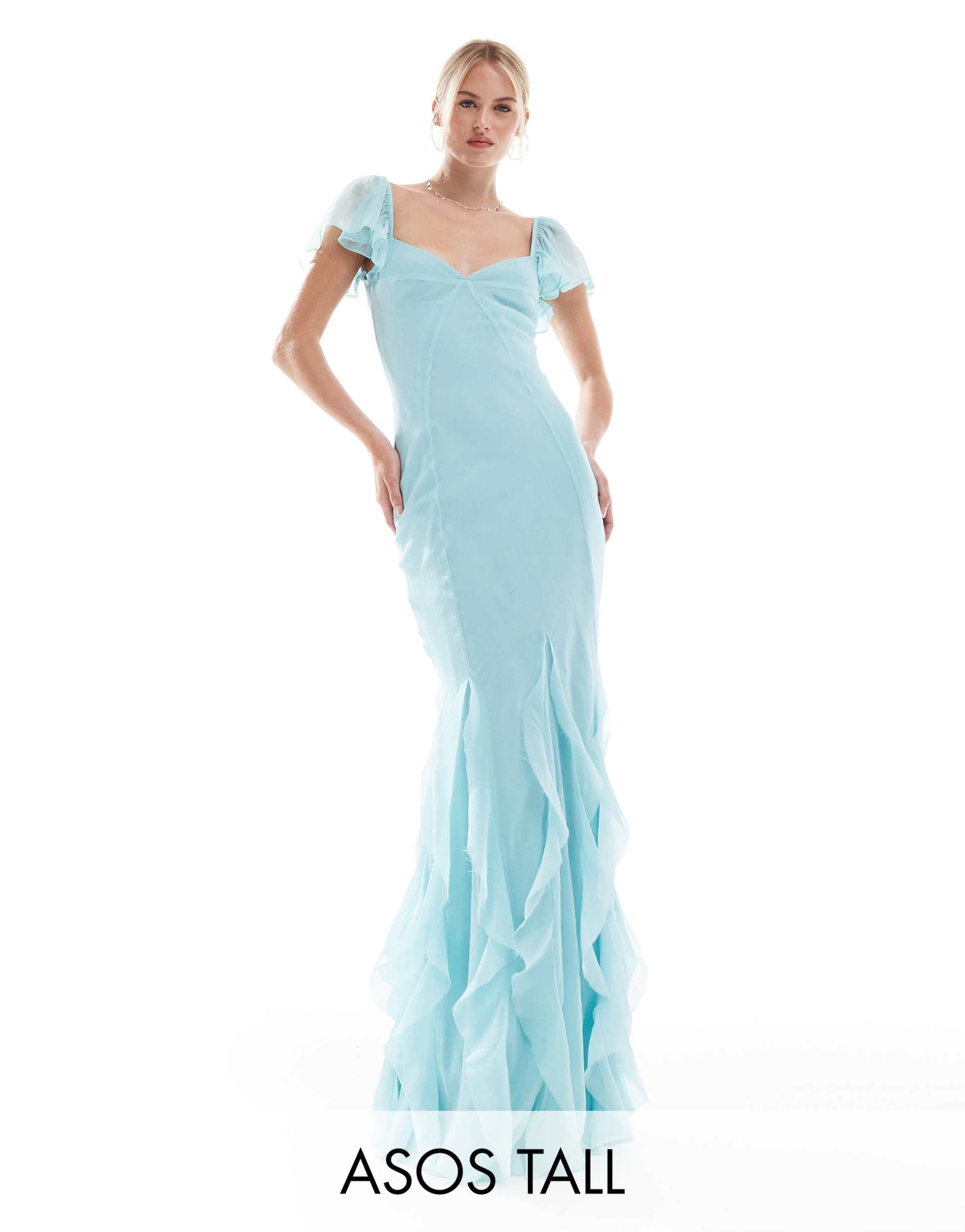 ASOS DESIGN TALL FLUTTER SLEEVE MAXI DRESS WITH RUFFLE GODETS IN BLUE