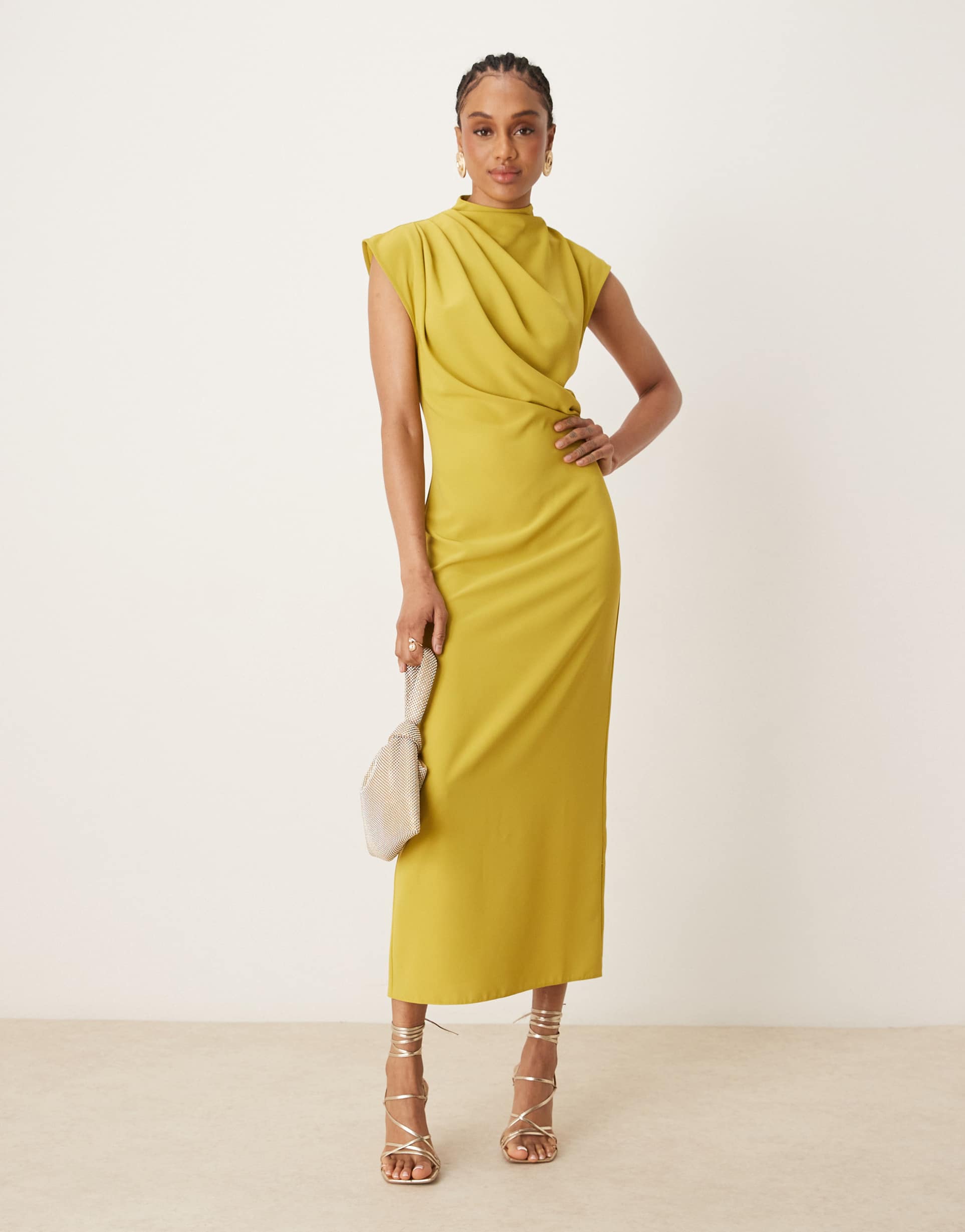 ASOS DESIGN TALL HIGH NECK SLEEVELESS MIDI DRESS WITH DRAPED NECK IN GOLD