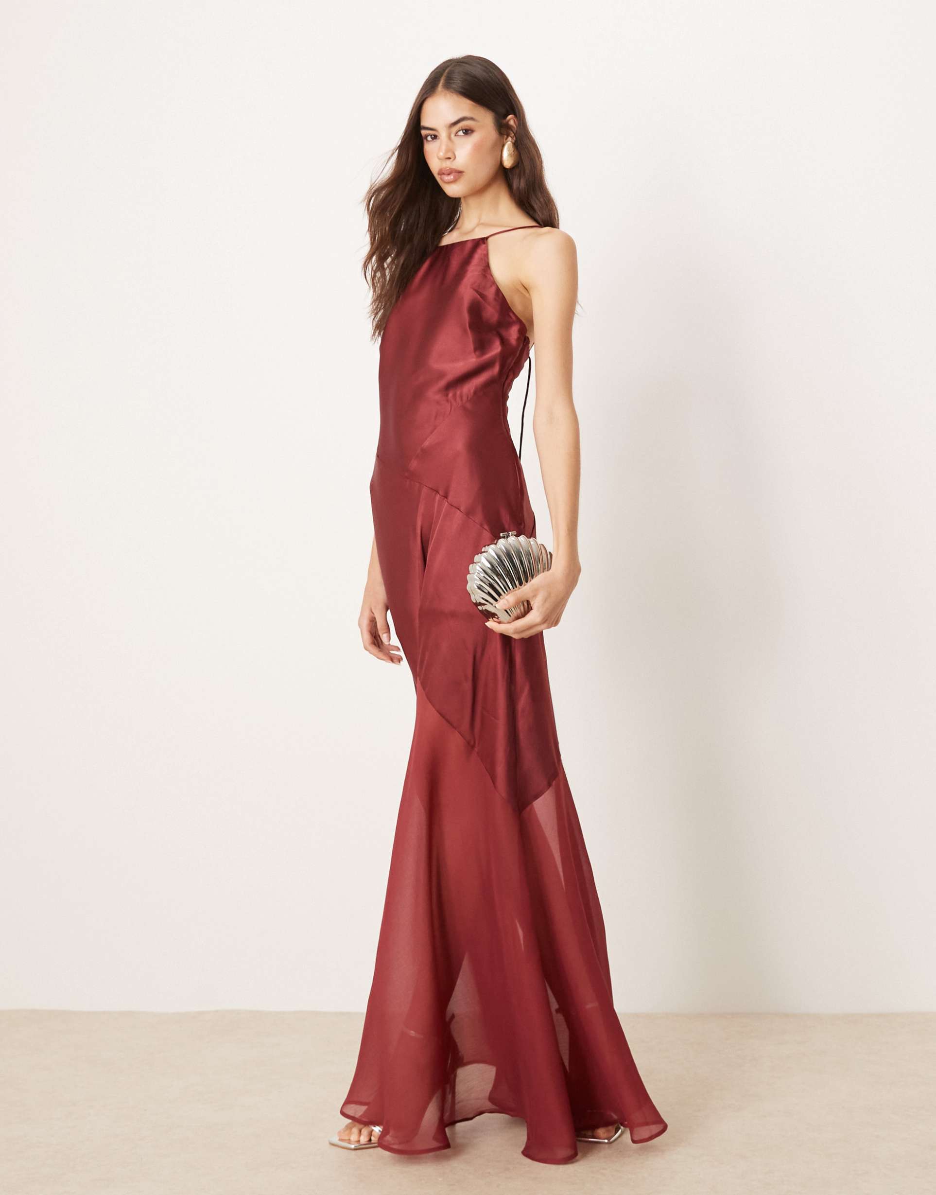 ASOS DESIGN TALL PANELED SATIN MAXI DRESS WITH CHIFFON SKIRT IN CHERRY RED