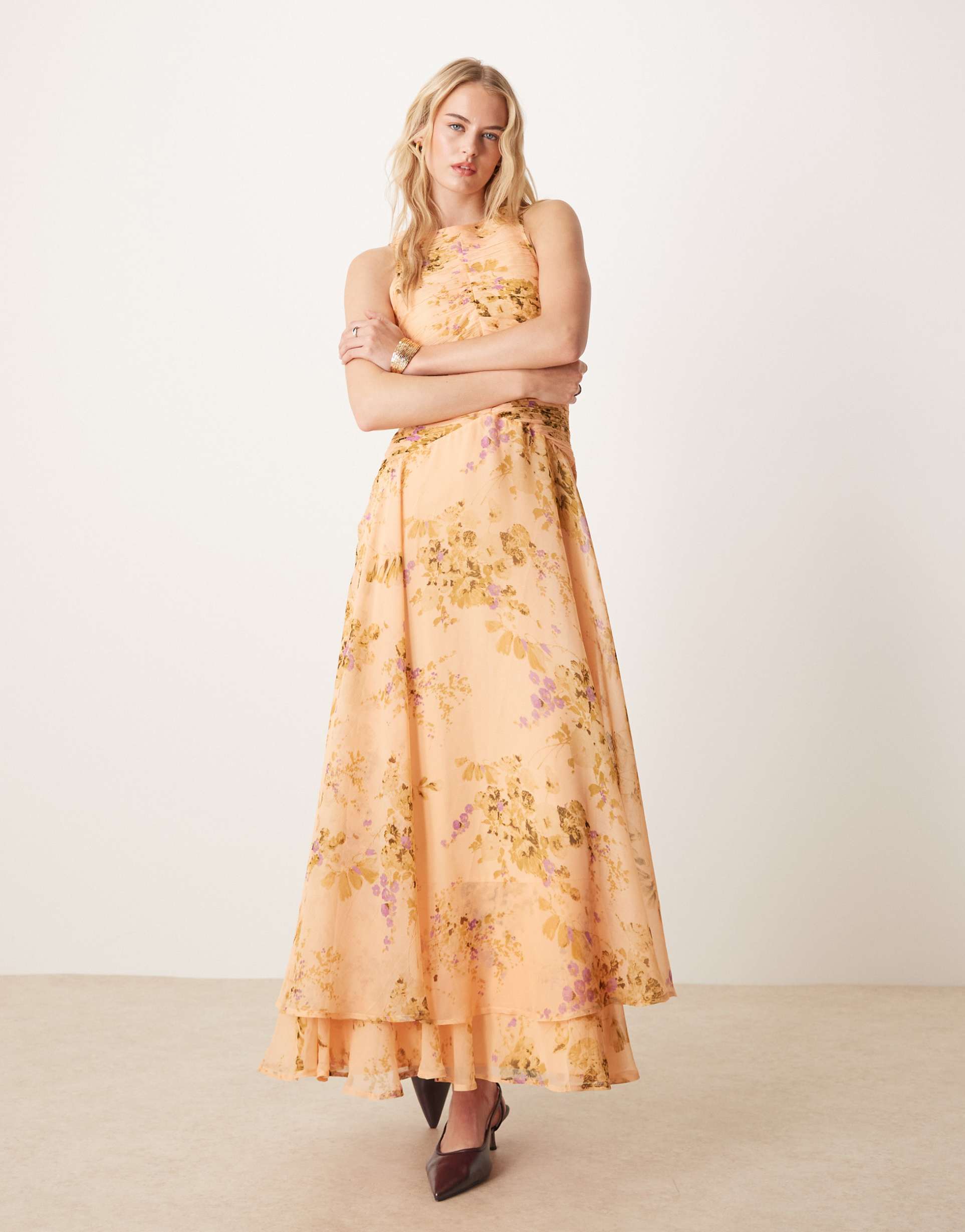 Soft matte peach fabric adorned with a delicate all-over floral print creates a romantic maxi dress perfect for spring and summer. The racer neck and sleeveless design offer a flattering silhouette, complemented by ruched detailing on the bodice and a graceful dropped waist. Its regular fit and layered hemline add effortless elegance, making it ideal for brunches, date nights, and wedding guest occasions. Crafted from lightweight polyester, this tall-length dress combines comfort with timeless style for versatile wear.