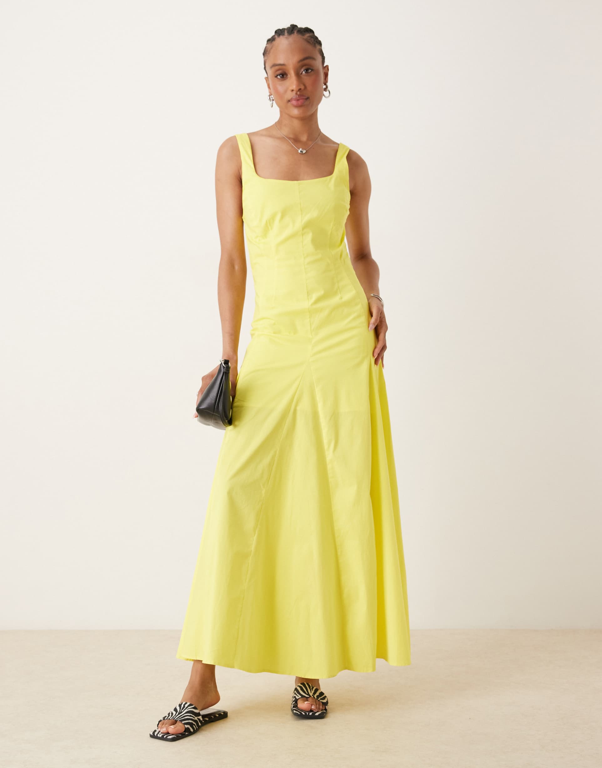 Bright yellow cotton with a touch of elastane creates a comfortable, regular fit midi dress designed for tall figures. The sleeveless cut and square neckline offer a clean and minimalist silhouette perfect for warm spring and summer days. Ideal for casual outings, brunch dates, or relaxed date nights, this plain-woven dress combines effortless style with breathable fabric. Its simple, solid color and clean hemline make it a versatile piece that can be dressed up or down, blending comfort and chic minimalism for everyday wear.