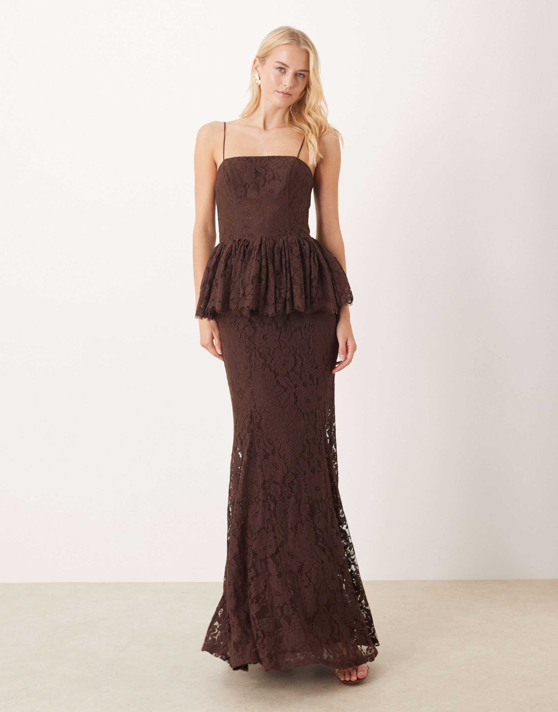 ASOS DESIGN TALL STRUCTURED LACE MAXI DRESS WITH VOLUME GODET BODICE IN CHOCOLATE
