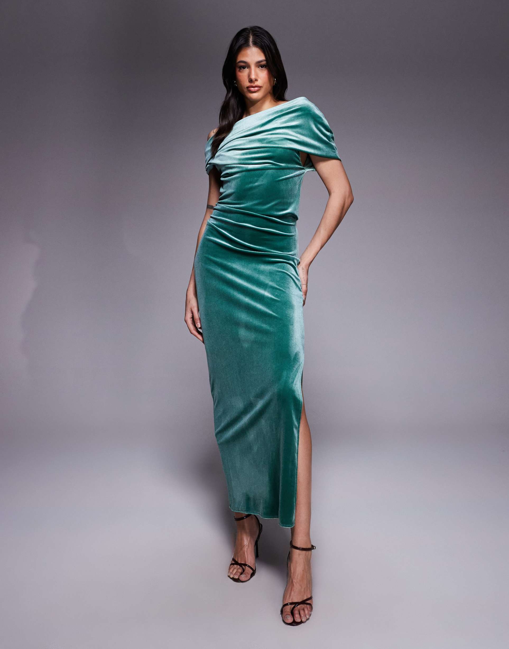 ASOS DESIGN TALL VELVET MIDI DRESS WITH FALLEN SHOULDERS IN TEAL