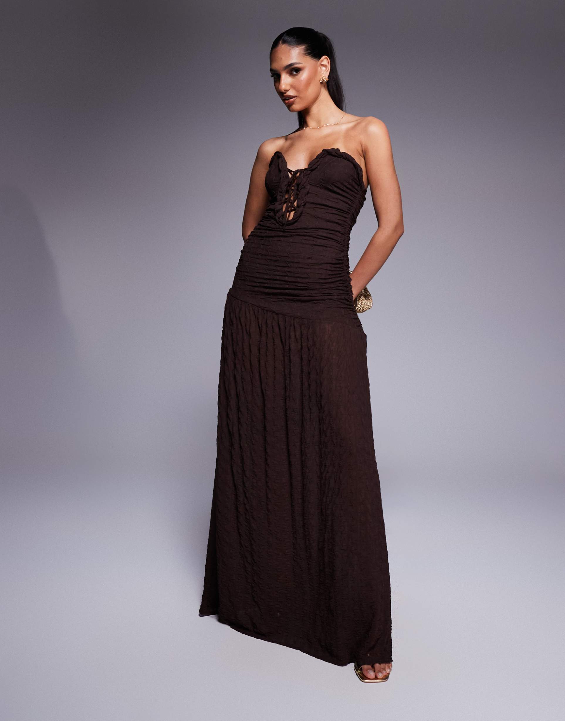 ASOS DESIGN TEXTURED BANDEAU MAXI DRESS WITH CURVED TRIM AND LACE UP DETAIL IN CHOCOLATE