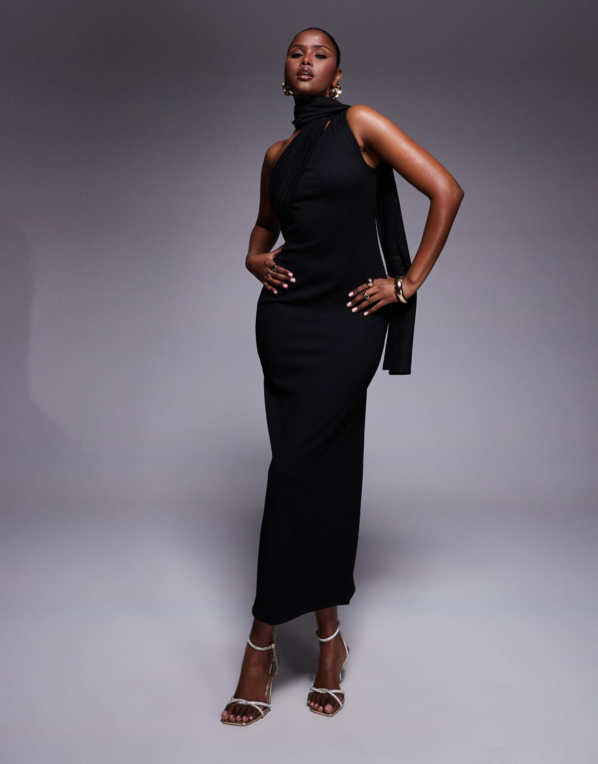 ASOS DESIGN TEXTURED CRINKLE ONE SHOULDER MIDI DRESS WITH SHEER NECK TIE SASH IN BLACK