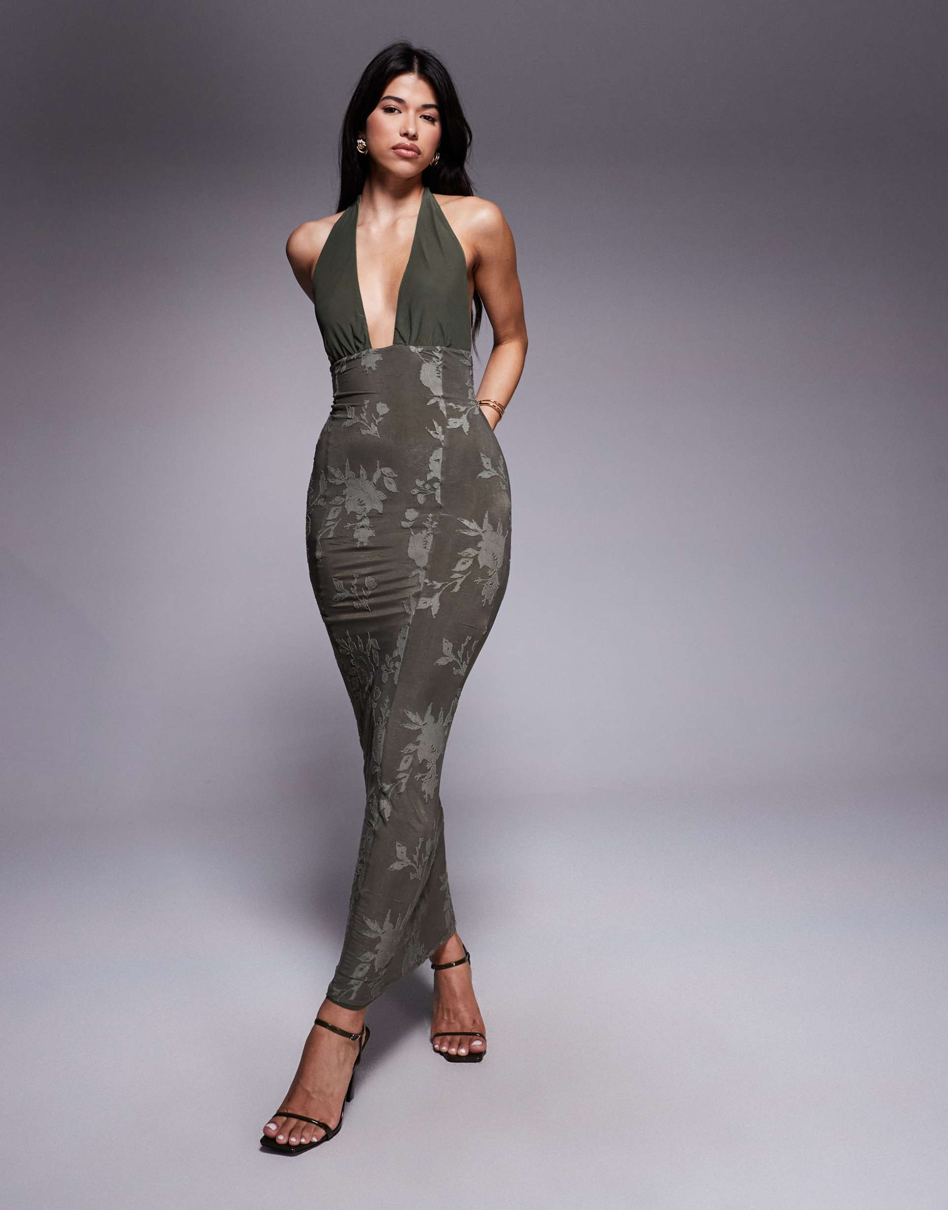 A sleek halter neckline and open back define this khaki maxi dress, crafted from soft, stretchy jersey fabric for a comfortable slim fit. The column silhouette gracefully flows to a clean hemline, adorned with an all-over floral texture that adds subtle dimension. Ideal for cocktail parties, date nights, or evening events, this modern elegant dress offers a tie-up closure for adjustable wear. Its versatile design and breathable fabric make it suitable for all seasons, combining style and comfort effortlessly.