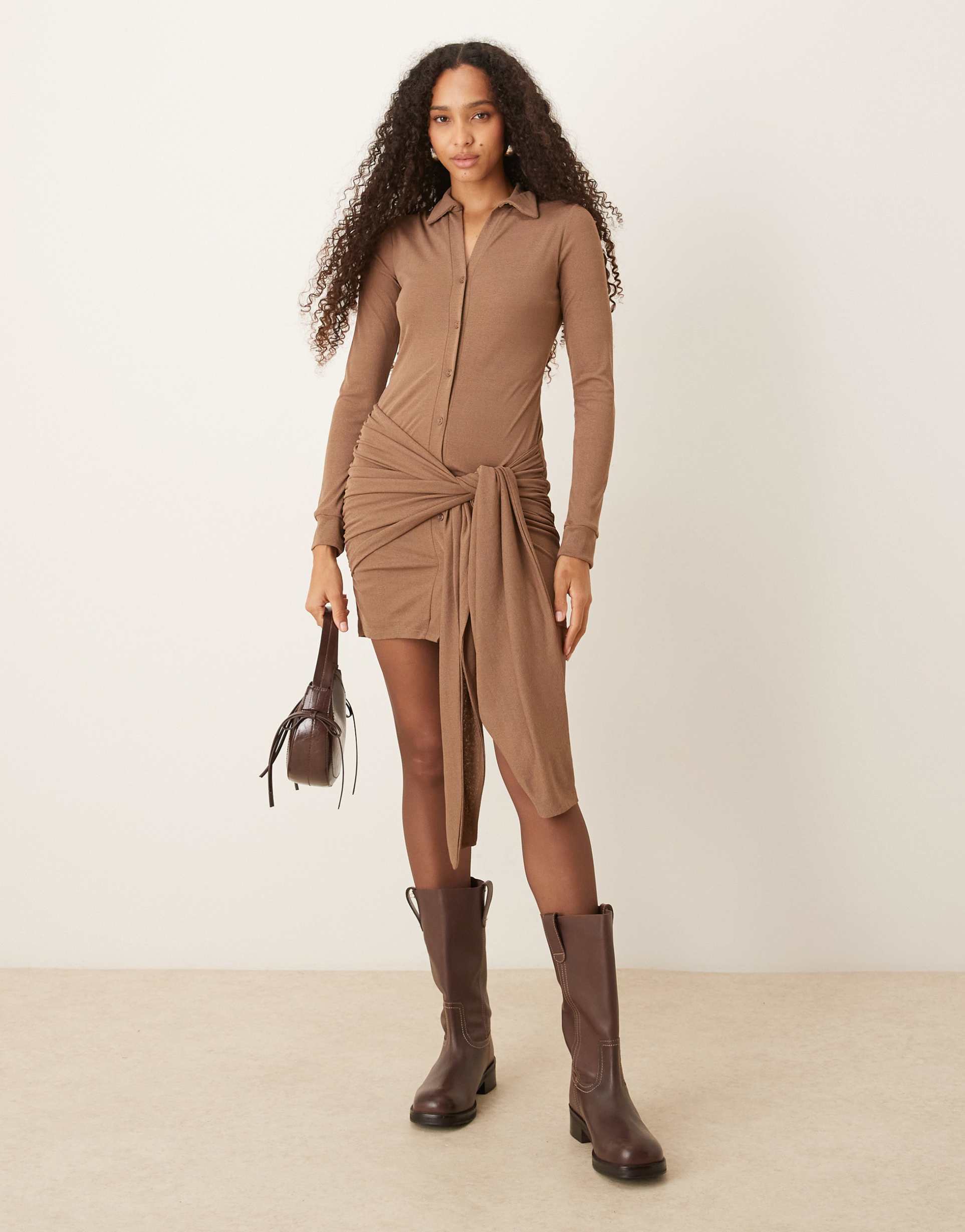 ASOS DESIGN TEXTURED MESH MINI SHIRT DRESS WITH WRAP TIE WAIST IN MOCHA
