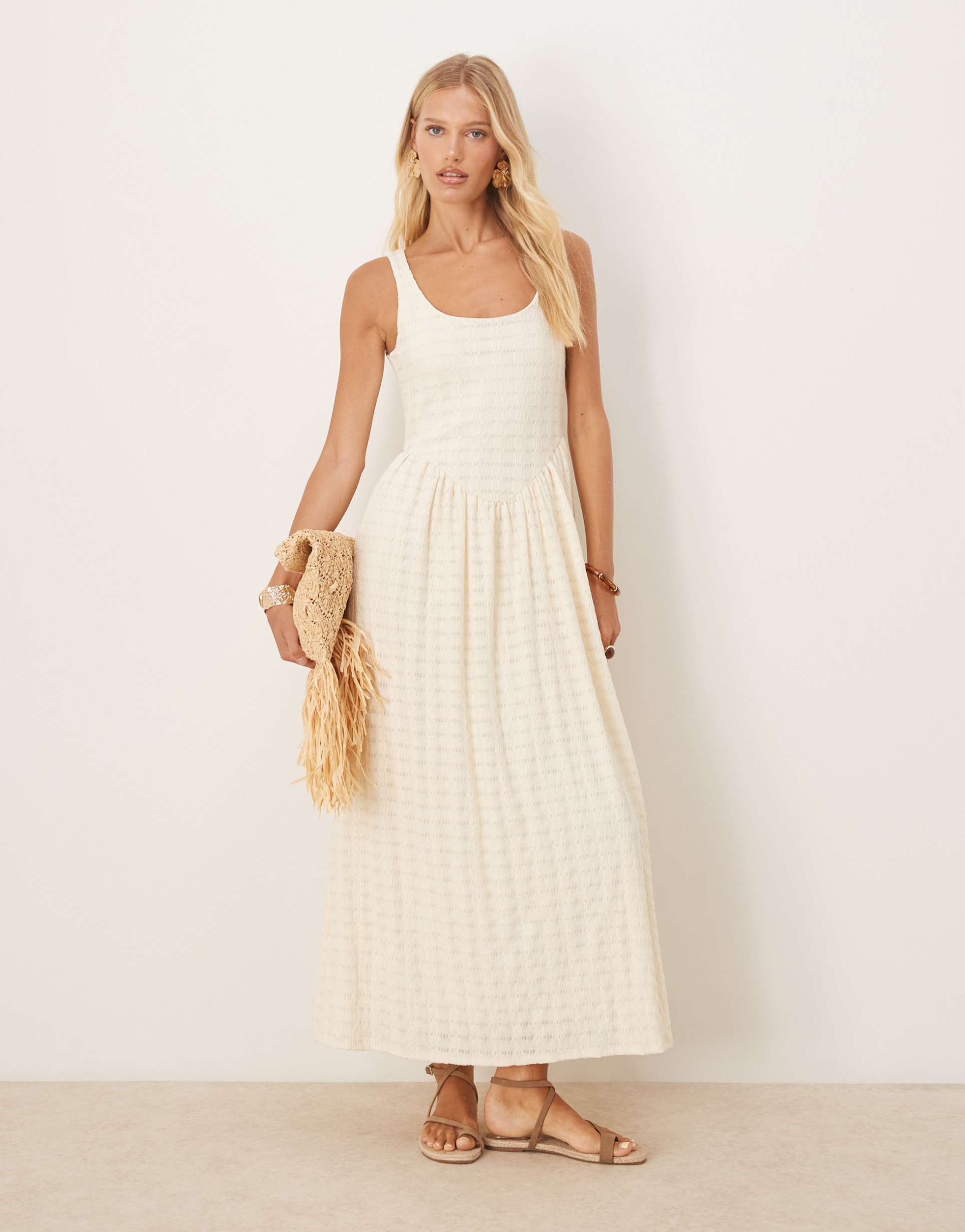 ASOS DESIGN TEXTURED SCOOP NECK DROP WAIST MIDI DRESS IN CREAM