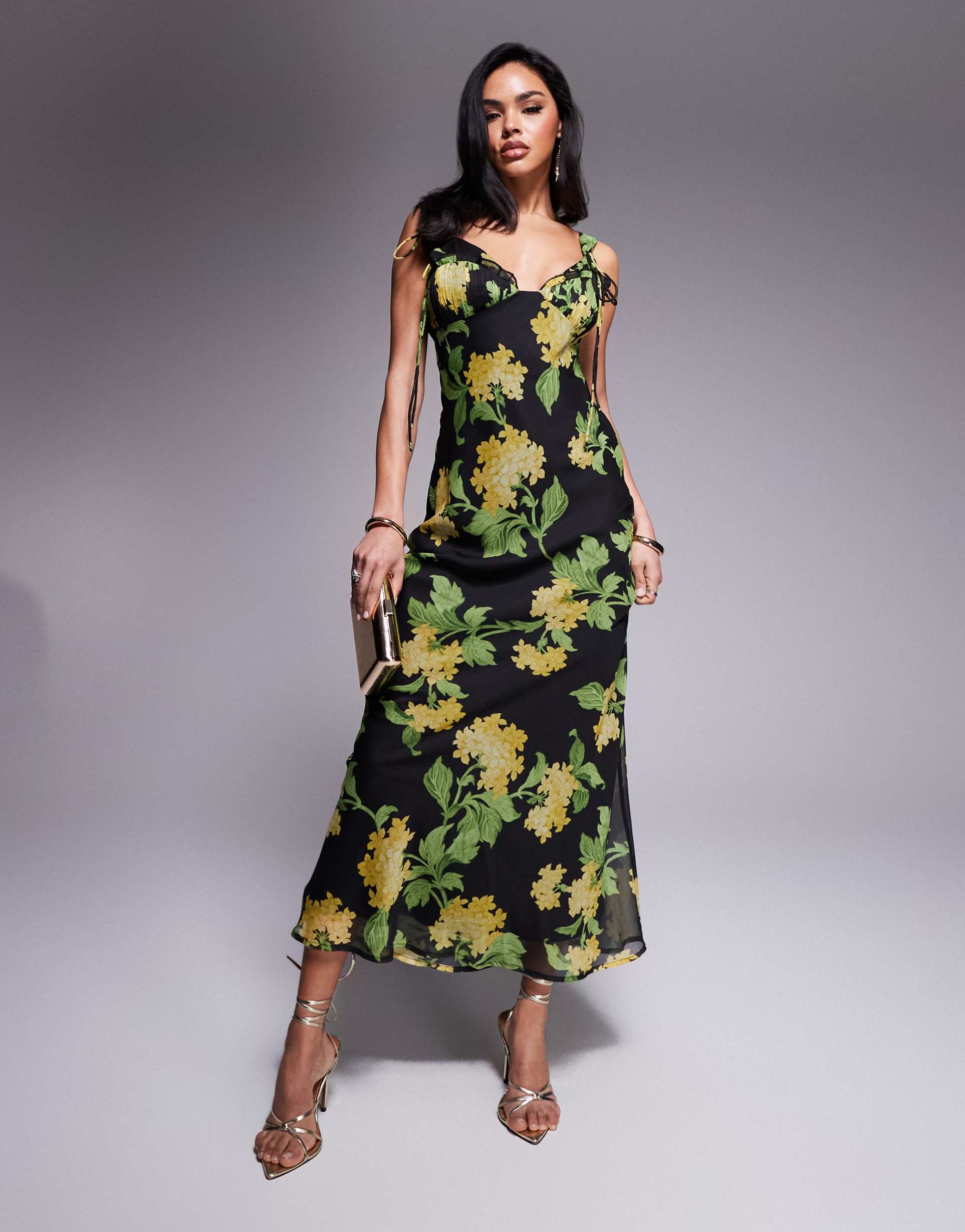ASOS DESIGN TIE DETAIL CORSET BIAS MAXI DRESS WITH FRILLS IN BLACK BASED FLORAL PRINT