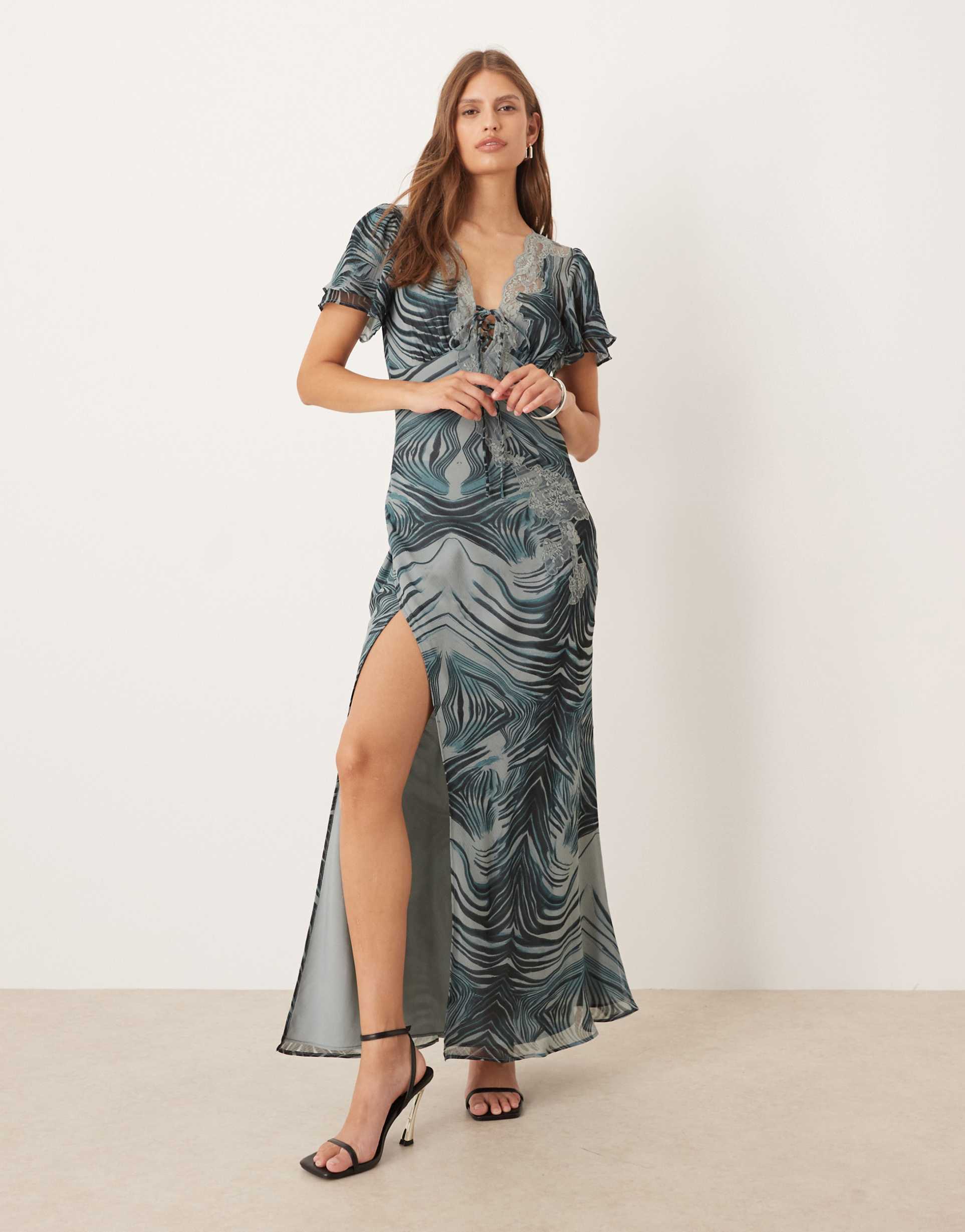 ASOS DESIGN TIE FRONT MAXI TEA DRESS WITH LACE DETAIL IN GRAY ZEBRA PRINT