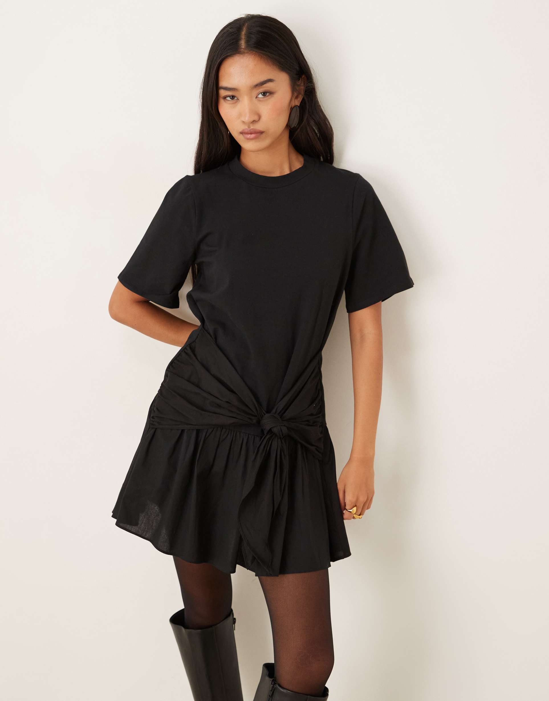 ASOS DESIGN TIE FRONT T-SHIRT MINI DRESS WITH POPLIN SKIRT IN BLACK
