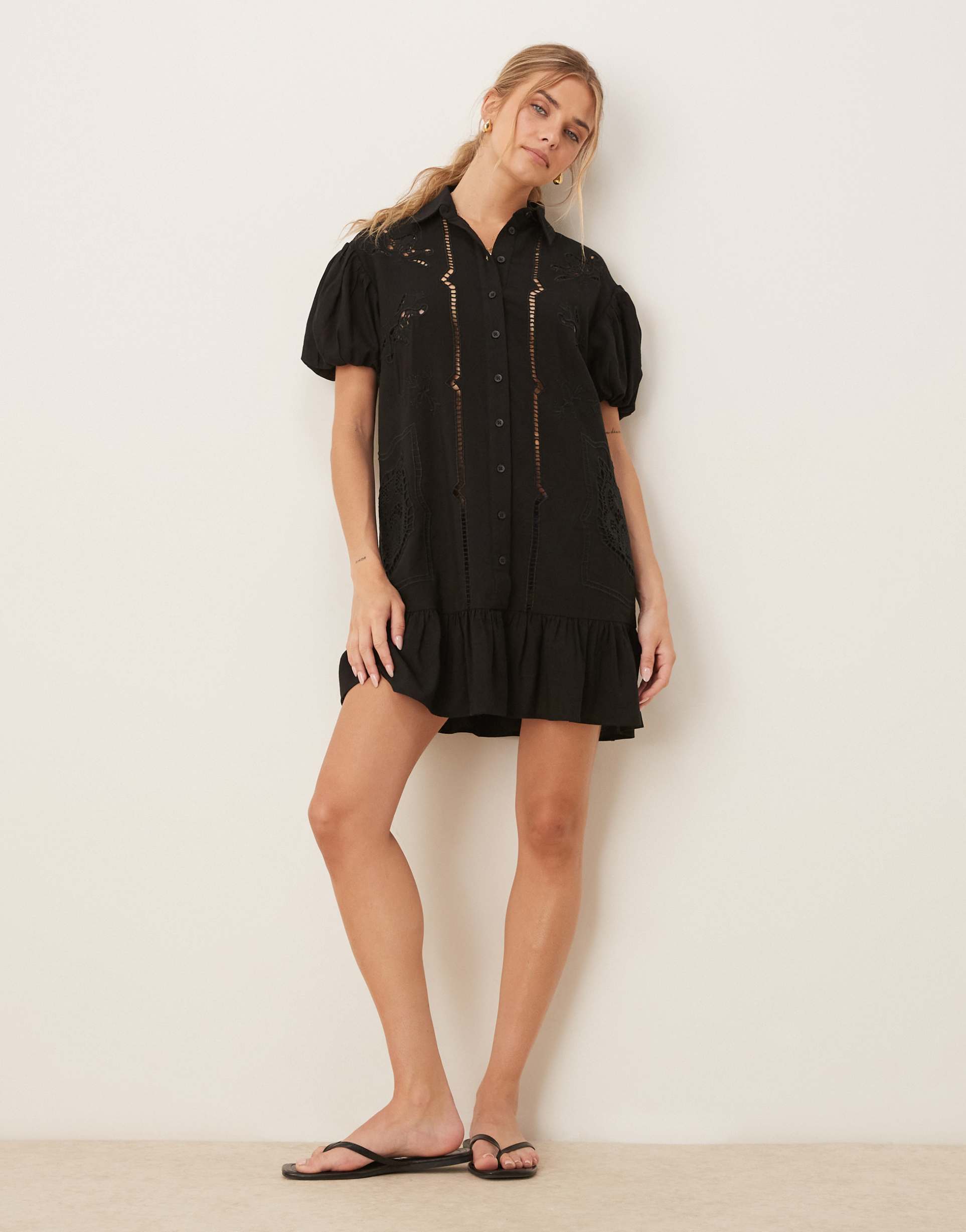 Tonal stitching and cut-out details add subtle interest to this matte black mini shirt dress crafted from breathable linen, viscose, and cotton blend. Featuring a classic spread collar, button placket, and short sleeves, its regular fit and ruffled hem create a relaxed yet polished silhouette perfect for spring and summer. Ideal for casual everyday wear, brunch outings, or laid-back weekends, this versatile dress combines minimalist style with effortless comfort.